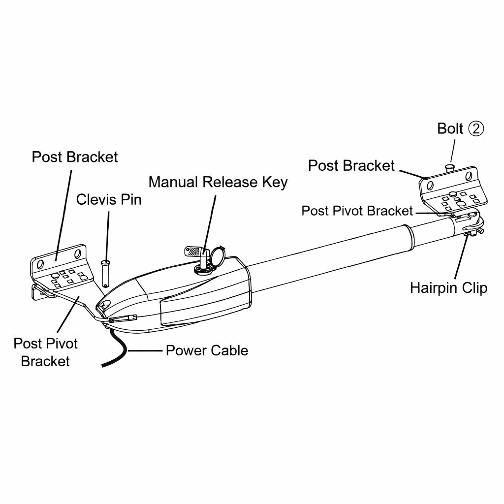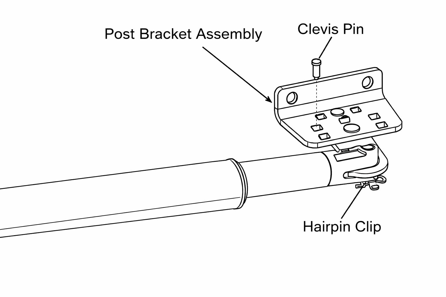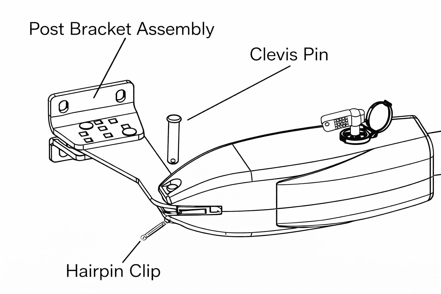 3. Instalación del brazo del motor: Conecte el brazo del motor al Soporte de Poste utilizando el Pasador de horquilla y asegúrelo con el Clip de horquilla.