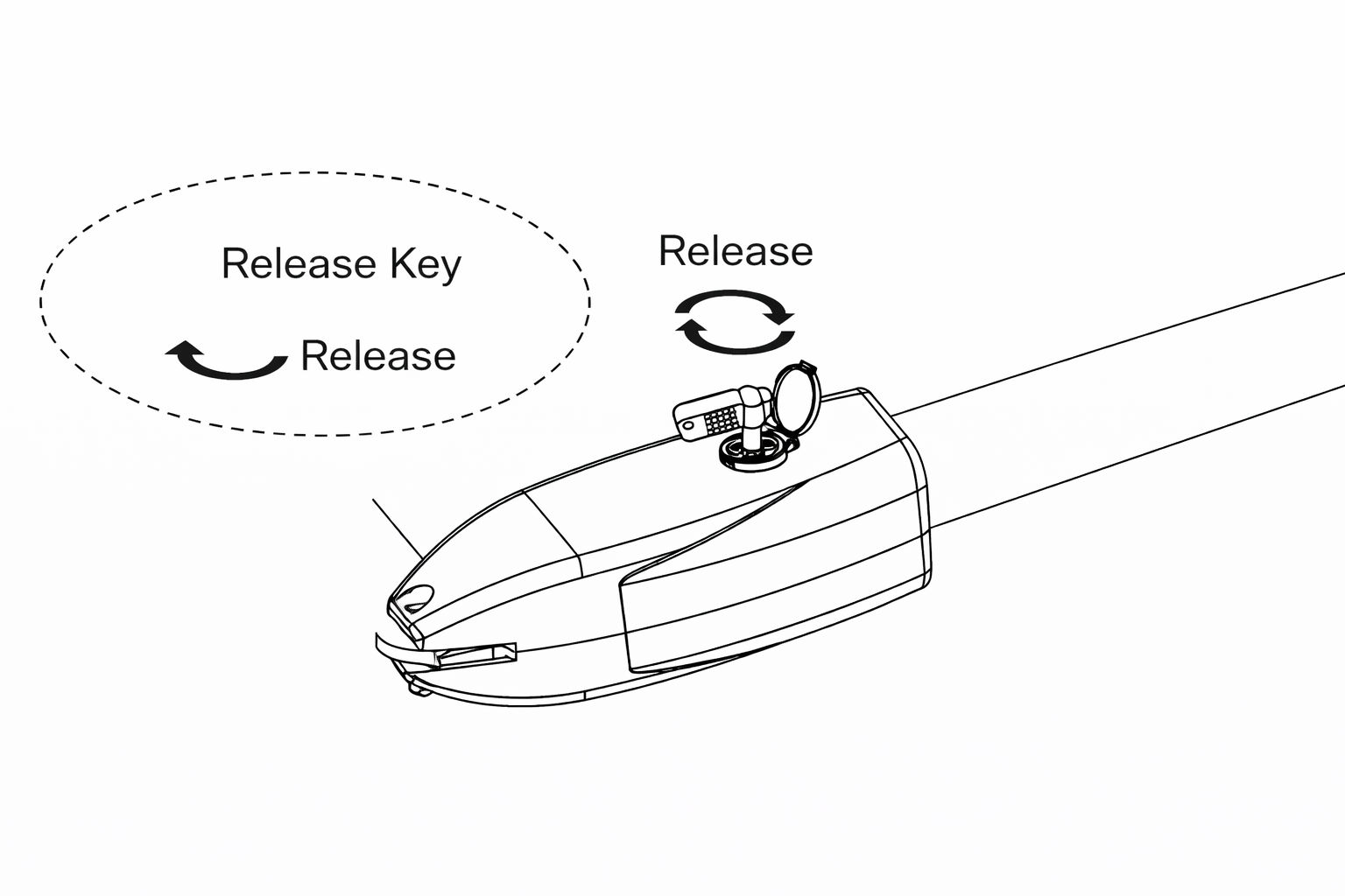 Abra el tapón del orificio de liberación en la parte superior del abridor de puerta, inserte la llave de liberación y gire la llave 90° en el sentido de las agujas del reloj. Esto libera el motor y permite que la varilla de empuje-tiro se extienda y retraiga manualmente. Para restaurar el funcionamiento normal, gire la llave 90° en sentido contrario a las agujas del reloj.