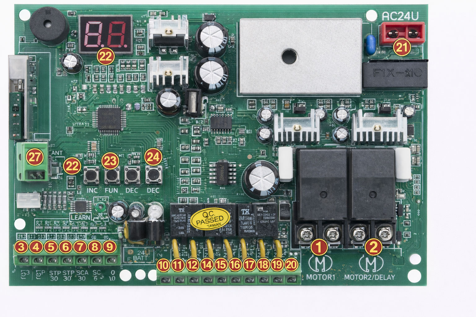MOTOR 1: Puerta esclava, cierra primero y abre última. Este terminal conecta el primer cable azul (contado de izquierda a derecha).