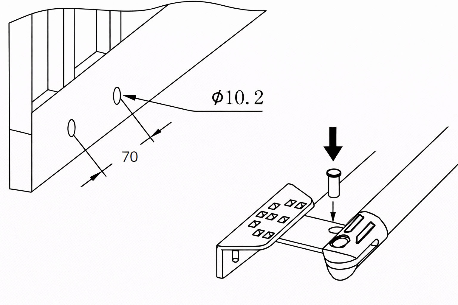 Taladre 2 agujeros de 10,2 mm de diámetro con un espacio de 70 mm entre los 2 agujeros. Ubique el soporte de puerta con ranuras de 2 agujeros sobre los agujeros perforados. Coloque el soporte final del motor al soporte de la puerta usando los pernos apropiados y apriete adecuadamente. Tenga en cuenta que los pernos utilizados para fijar el soporte delantero a la puerta no están proporcionados, debido a que el grosor de cada puerta es diferente. Inserte el pasador de bloqueo y las arandelas de sujeción.
