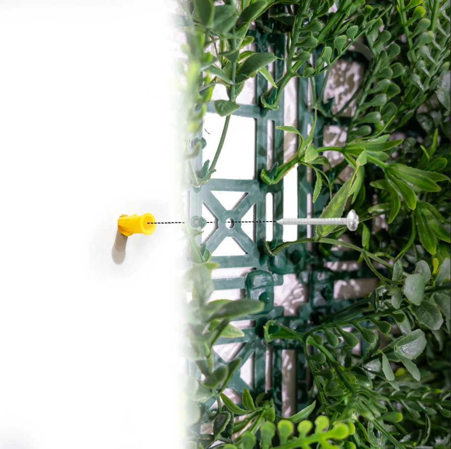 Coloque el taco para pared en la superficie a la que desea fijar el muro vegetal artificial. Atornille el azulejo de pared al taco utilizando los tornillos para asegurar el azulejo a través de los agujeros en la malla del azulejo de pared.