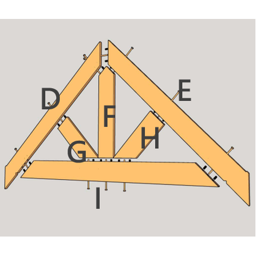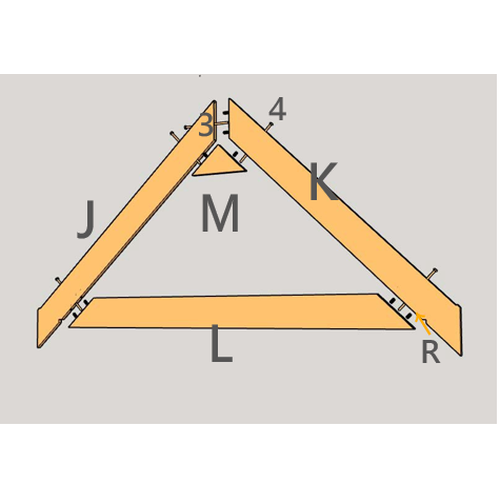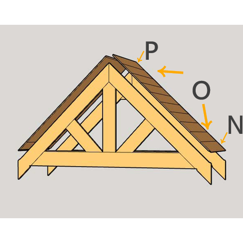 Finalmente, como se muestra en la figura, fije los paneles del techo (Partes N, O y P) a la tabla frontal de los aleros y a la tabla trasera utilizando tornillos para madera (Parte 5) para formar una unidad integrada única.