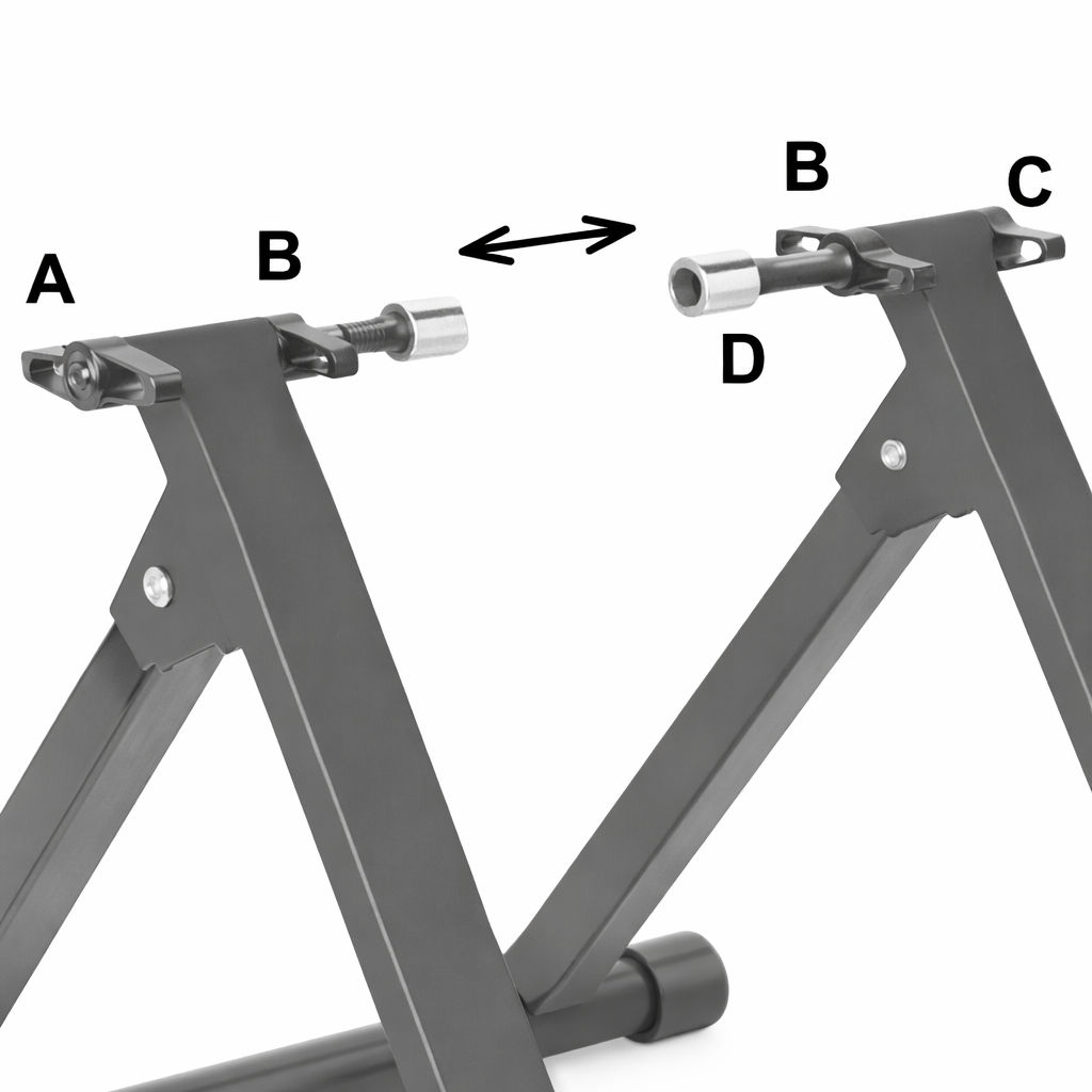 Étape 3 - Avant de placer le vélo dans le home trainer, tournez le serre-moyeu droit D et relâchez l'écrou papillon A ou ajustez l'écrou papillon B du côté gauche pour créer un large dégagement entre les accouplements.