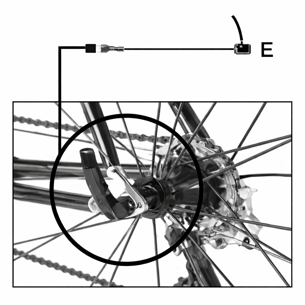 Étape 2 - Remplacez la broche de serrage rapide sur la roue arrière de votre vélo par la broche E incluse avec le home trainer. Cela assure un ajustement idéal et une stabilité optimale.