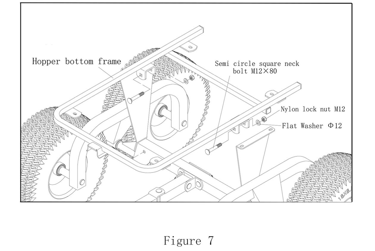 Comme indiqué à la Figure 7, utilisez 2 x Boulons à col carré demi-cercle M12x80, 2 x Rondelles plates φ12, et 2 x Écrous frein en nylon M12 pour installer le cadre inférieur de la trémie et le cadre du corps ensemble (voir Figure 8).