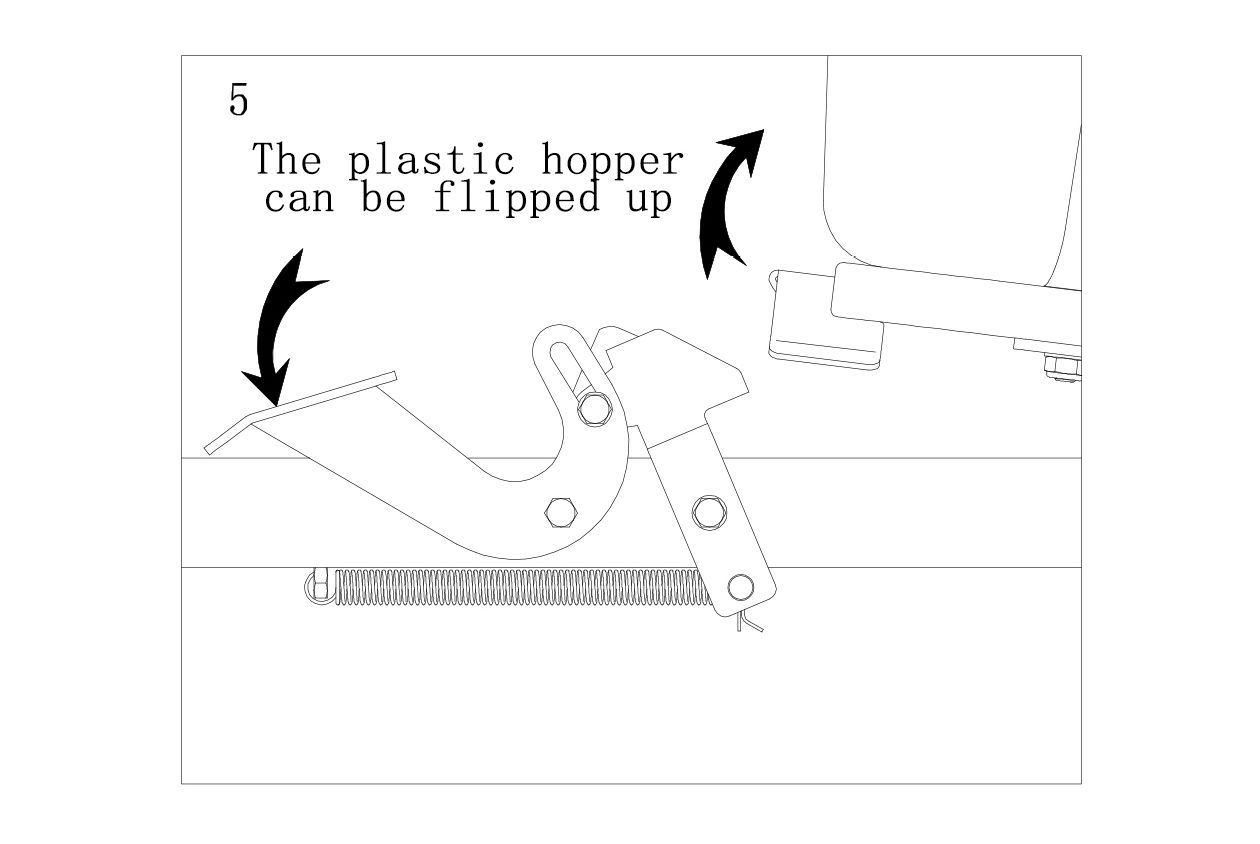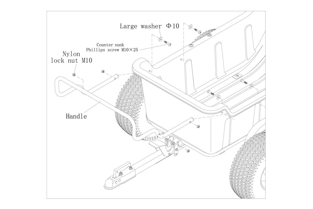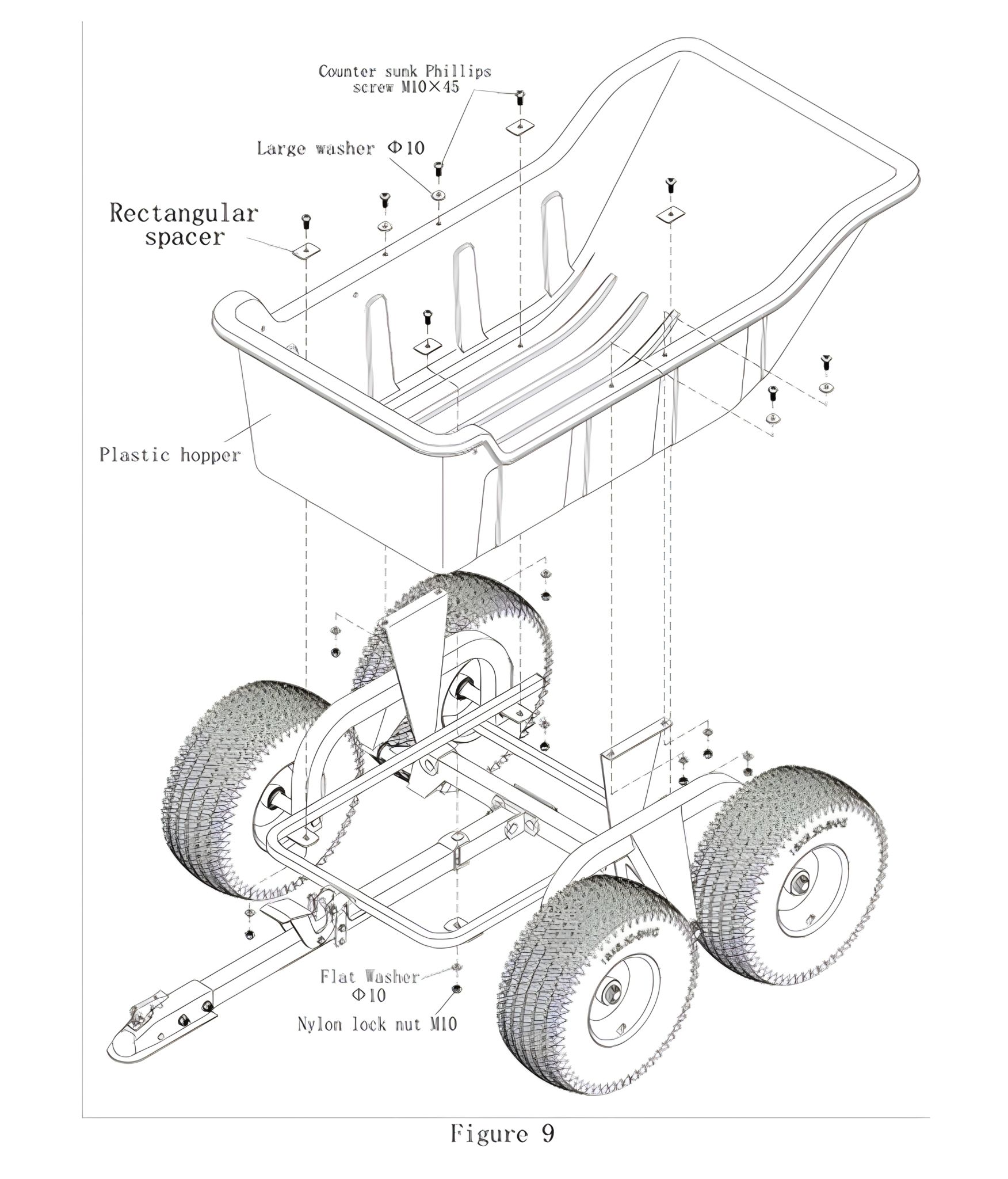 1. Comme indiqué sur la Figure 9, utilisez 8 x Vis à tête fraisée cruciforme M10x45, 8 x Rondelles plates φ10, 4 x Grandes rondelles φ10, 8 x Écrous frein en nylon M10 et 4 x Entretoises rectangulaires pour installer la trémie au Cadre inférieur de la trémie. 2. Comme indiqué sur la Figure 10, installez la Poignée sur le corps avec 4 x Vis à tête fraisée cruciforme M10x25, 4 x Grandes rondelles φ10, et 4 x Écrous frein en nylon M10. L'assemblage est terminé.