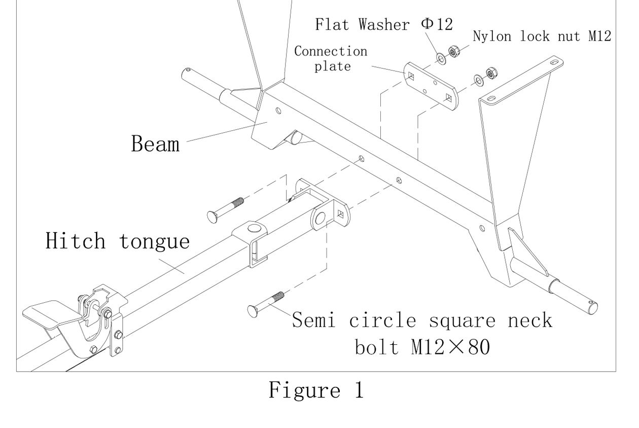 Comme indiqué à la Figure 1, utilisez 2 x Boulons à col carré demi-cercle M12x80, 2 x Rondelles plates φ12, 2 x Écrous frein en nylon M12, et 1 Plaque de connexion pour installer ensemble le Composant de barre de remorquage et la Poutre (voir Figure 2).