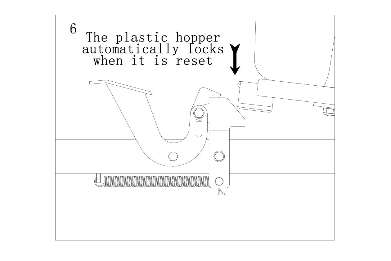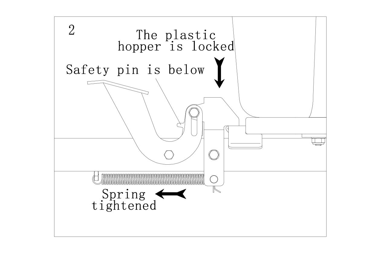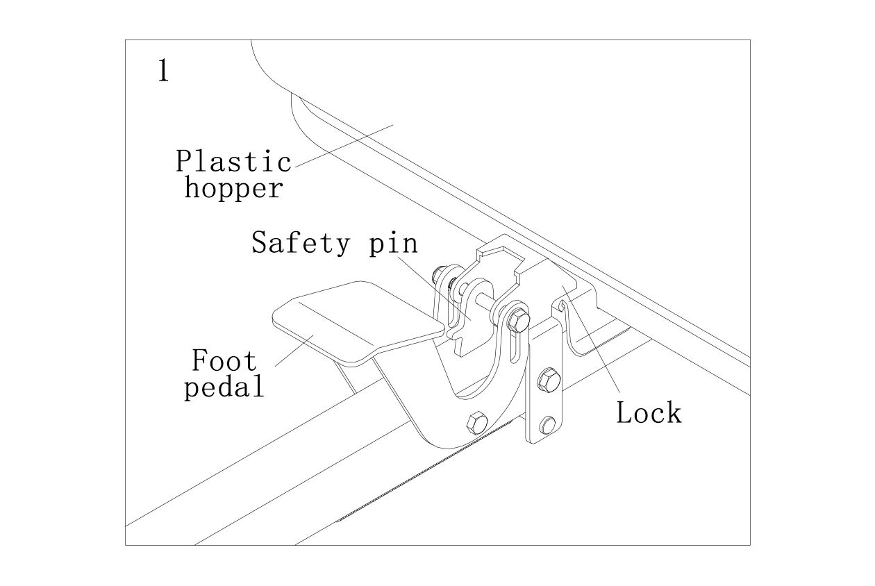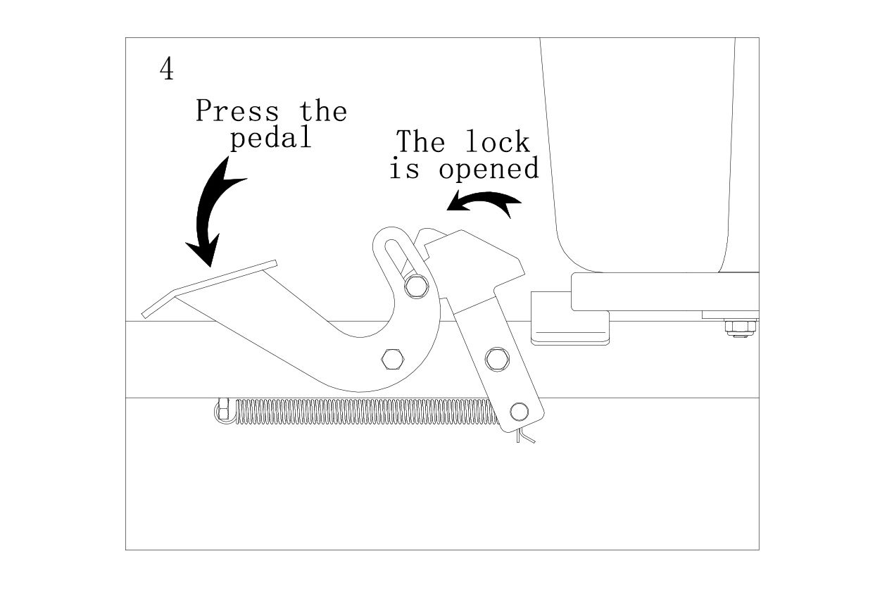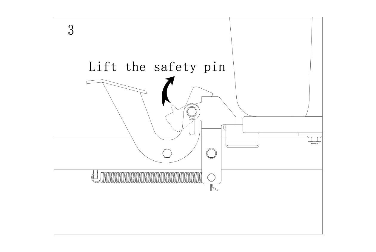 1. Relevez le dispositif de sécurité et appuyez sur la pédale pour libérer la benne pour le déchargement. 2. Lors du remorquage de la remorque, abaissez le dispositif de sécurité pour verrouiller la benne afin d'éviter un déchargement accidentel.