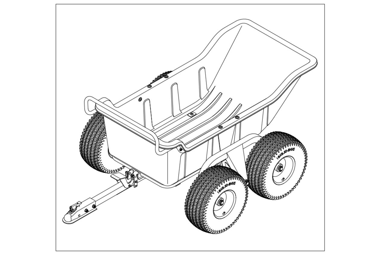 NE PAS effectuer de virages serrés qui pourraient amener les pneus du Tracteur de pelouse/jardin ou du quad à frotter contre la Remorque Basculante.