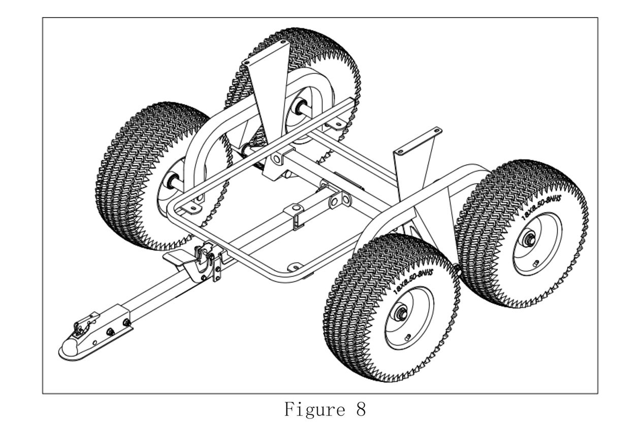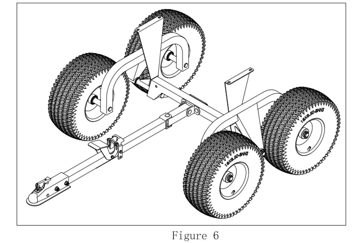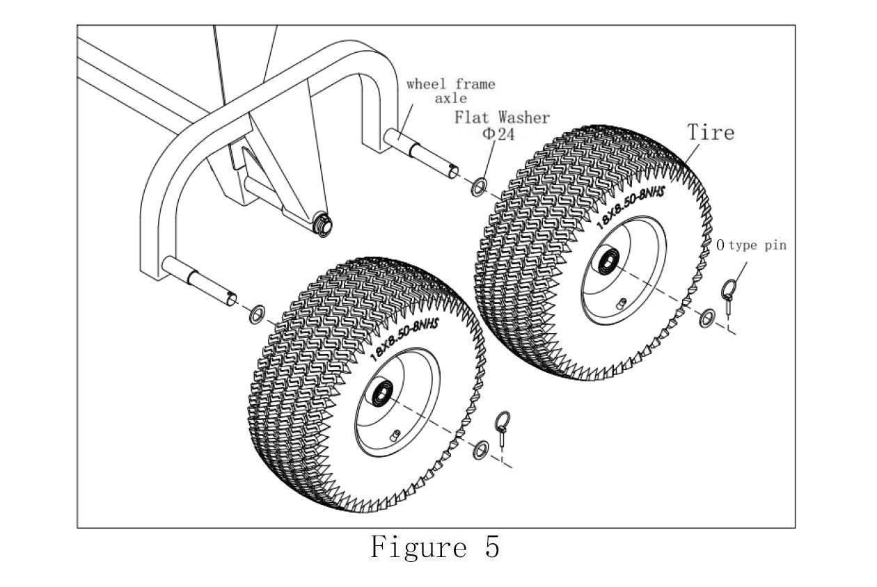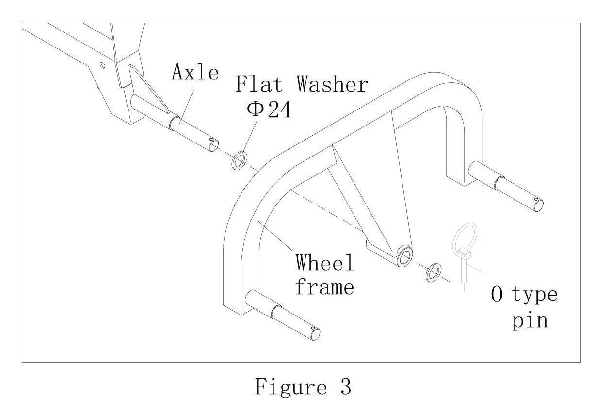 1. Comme indiqué sur la Figure 3, utilisez 2 x Rondelles plates φ24 et 1 x goupille de type 0 pour installer un Cadre de roue sur l'Axe d'un côté de la Poutre, et installez le Cadre de roue de l'autre côté de la même manière (voir Figure 4). 2. Comme indiqué sur la Figure 5, utilisez 2 x Rondelles plates φ24 et 1 x goupille de type 0 pour installer un Pneu sur l'Axe du Cadre de roue. La valve de gonflage du pneu est à l'extérieur. Ensuite, installez le deuxième Pneu et utilisez la même méthode de l'autre côté. Installez 2 Pneus (voir Figure 6).