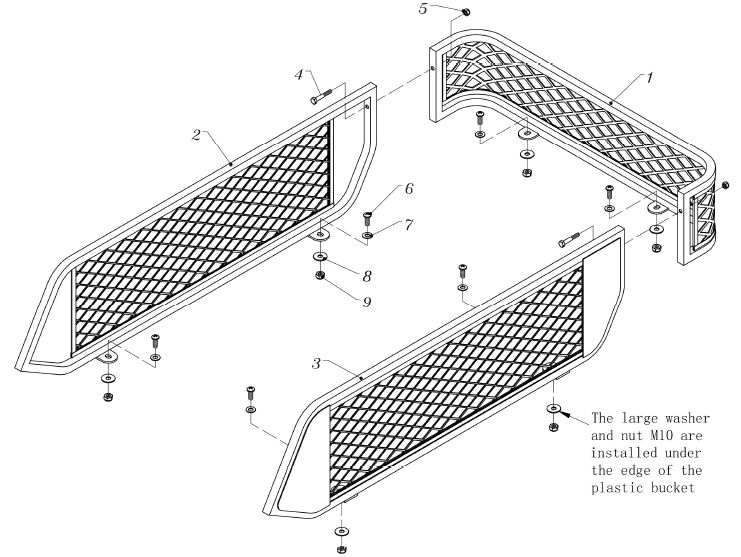 1. Placez l'Extension de clôture avant sur le cadre de la trémie et alignez les trous de fixation. 2. Utilisez les Boulons M10*25 pour fixer l'extension de clôture avant au cadre de la trémie. 3. Serrez les boulons avec un tournevis cruciforme. 4. Répétez le processus pour l'Extension de clôture droite et l'Extension de clôture gauche. 5. Assurez-vous que toutes les extensions de clôture sont solidement fixées avant de continuer.