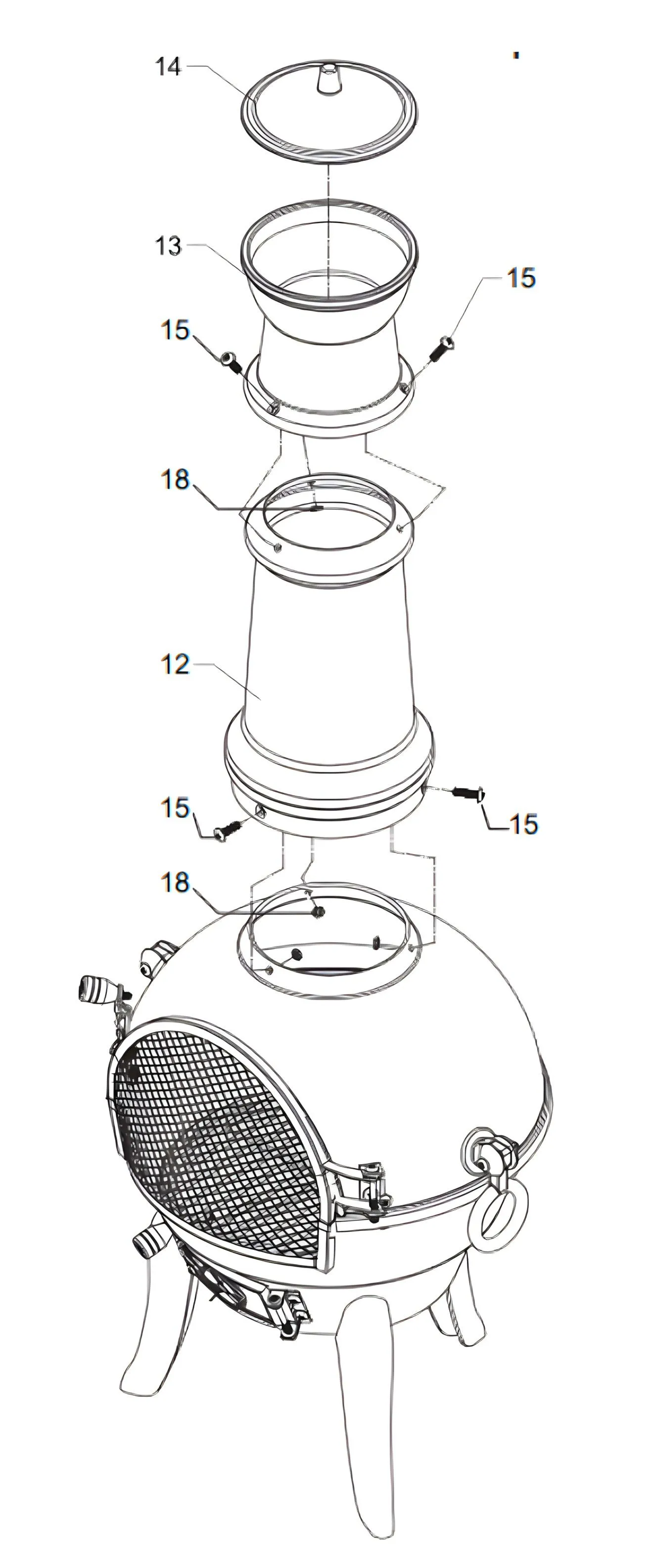 Per completare la chimenea, collegare la base del camino (parte 12) al coperchio della ciotola (parte 6), e poi collegare il camino (parte 13) alla base del camino (parte 12). Utilizzare le viti (parte 15) e i dadi (parte 18) per fissare queste parti.
