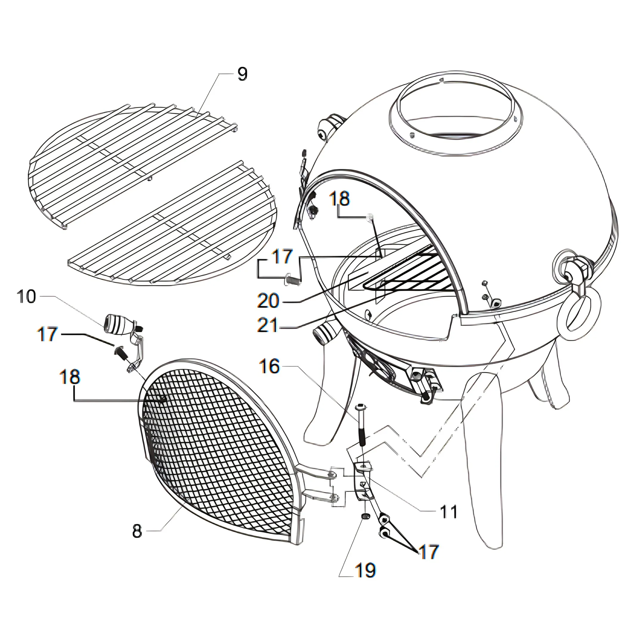 All'interno del camino e sopra il cancello per carbone, fissare i ripiani (parte 20) sul lato destro e sinistro, utilizzando le viti (parte 17) e i dadi (parte 18). Procedere posizionando la griglia (parte 21) tra i ripiani (parte 20).