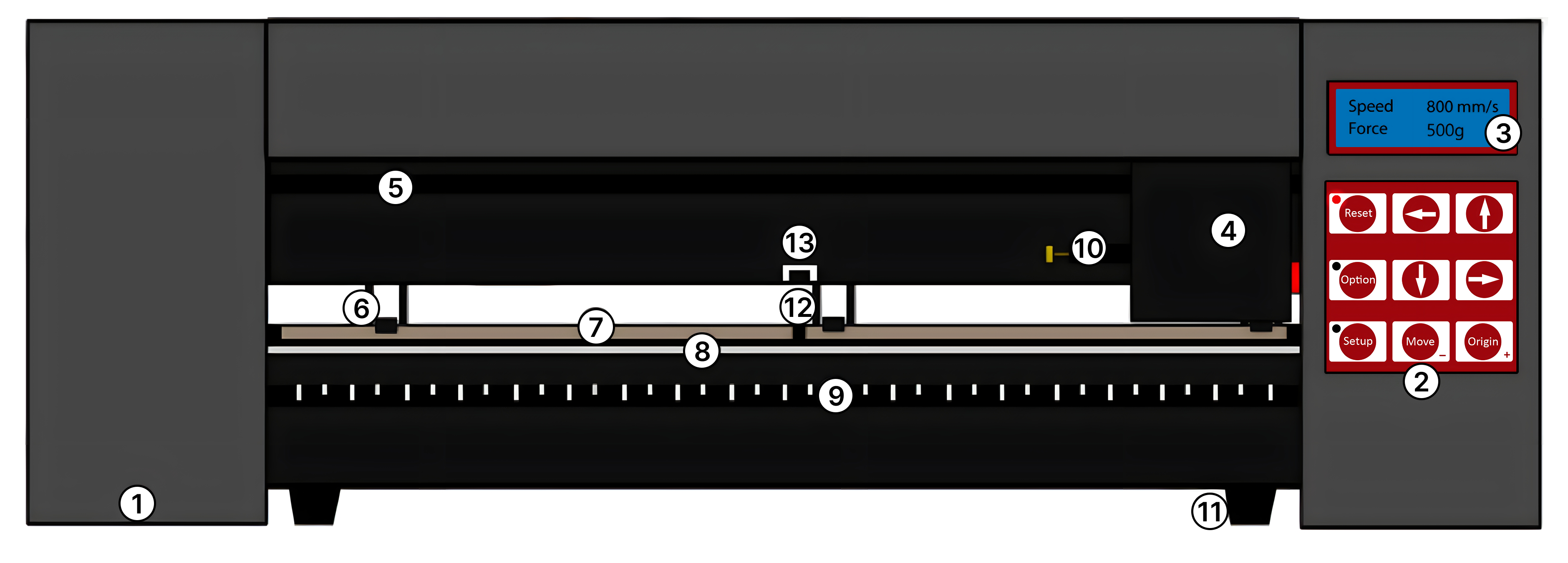1. Pod laterale: L'interruttore On/Off è posizionato sul lato sinistro 2. Pannello di controllo: Regola le impostazioni tra cui velocità, pressione e posizione della lama 3. Schermo LED: Visualizza le impostazioni dei parametri 4. Carrello della lama: Tiene la lama e si muove attraverso il vinile durante il taglio 5. Cinghia del carrello: Il carrello si muove avanti e indietro lungo la cinghia 6. Rulli di pressione: Tengono il vinile in posizione e lo muovono durante il taglio 7. Rullo di presa: Aiuta a muovere il vinile durante il taglio 8. Striscia di taglio: Mantiene il vinile livellato durante il taglio 9. Guida righello: Aiuta ad allineare il vinile 10. Presa della lama: Tiene il porta lama 11. Piedini: Si appoggiano sulla superficie di lavoro o si inseriscono nel supporto incluso 12. Cuscinetti: Permettono al rullo di presa di muoversi 13. Guida di posizionamento dei rulli di pressione: Mostra dove è posizionato il cuscinetto centrale, i rulli di pressione non devono essere situati sui cuscinetti o sotto questa guida.