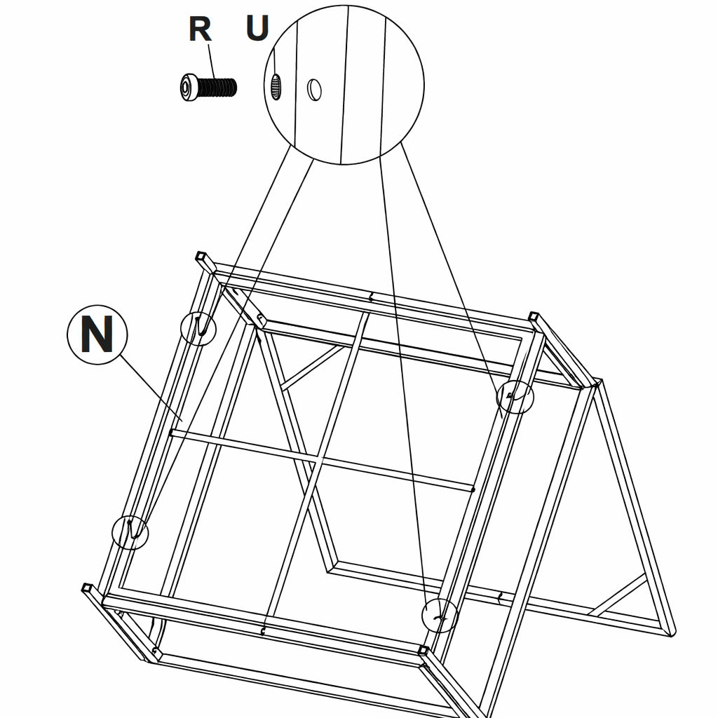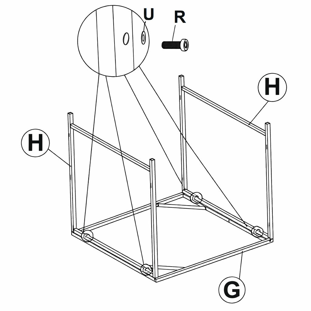 * Allineare i fori. 3. Inserire Parte U attraverso i fori. 4. Fissare con Parte R. 5. Ripetere per i restanti telai delle gambe (Parte H).