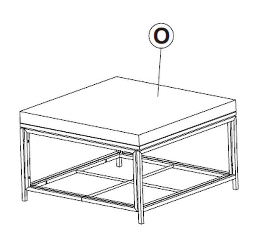 1. Posizionare la Parte del Tavolino da Caffè I sopra le gambe del tavolo. 2. Assicurarsi che tutti gli angoli siano allineati con le gambe. 3. Inserire la Parte del tavolo U attraverso i fori in ogni angolo. 4. Fissare con la Parte del tavolo R. 5. Ripetere per tutti i punti di connessione mostrati.
