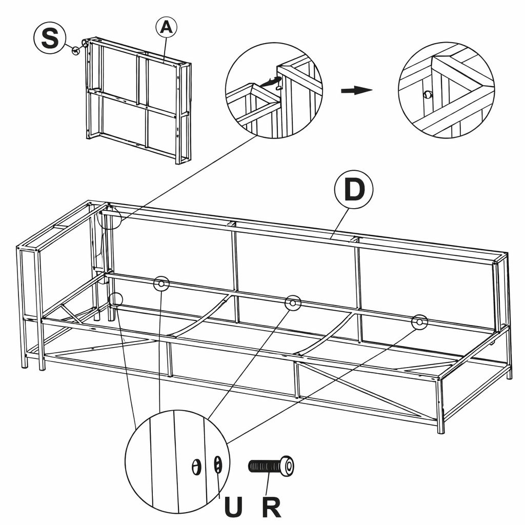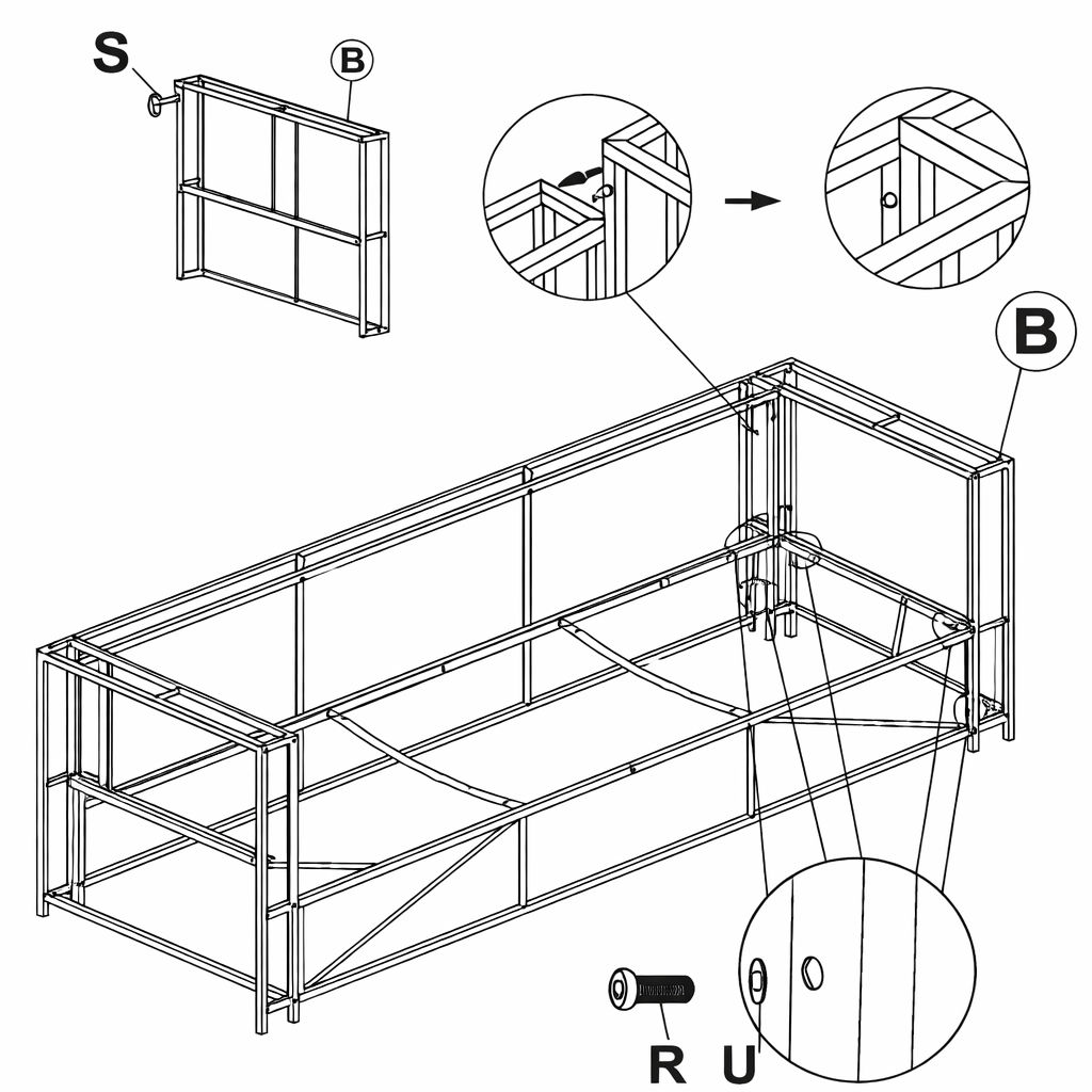 1. Prendi la Parte del Tavolo B. 2. Posizionala sull'altra estremità aperta del telaio del divano. 3. Assicurati che gli angoli combacino correttamente. 4. Inserisci la Parte del Tavolo S nell'angolo superiore e stringi. 5. Allinea i fori del pannello laterale con i fori sulla base e sul telaio posteriore. 6. Inserisci la Parte del Tavolo U attraverso i fori. 7. Fissa con la Parte del Tavolo R.