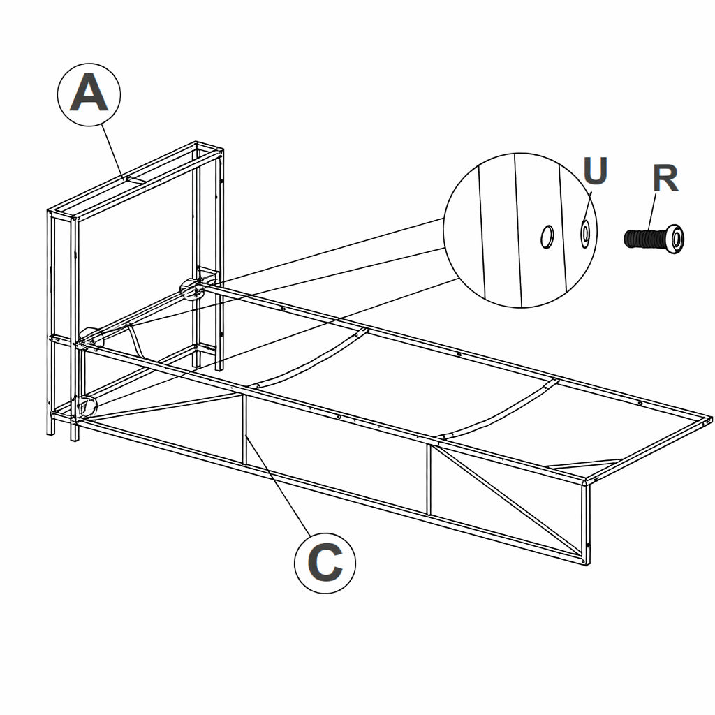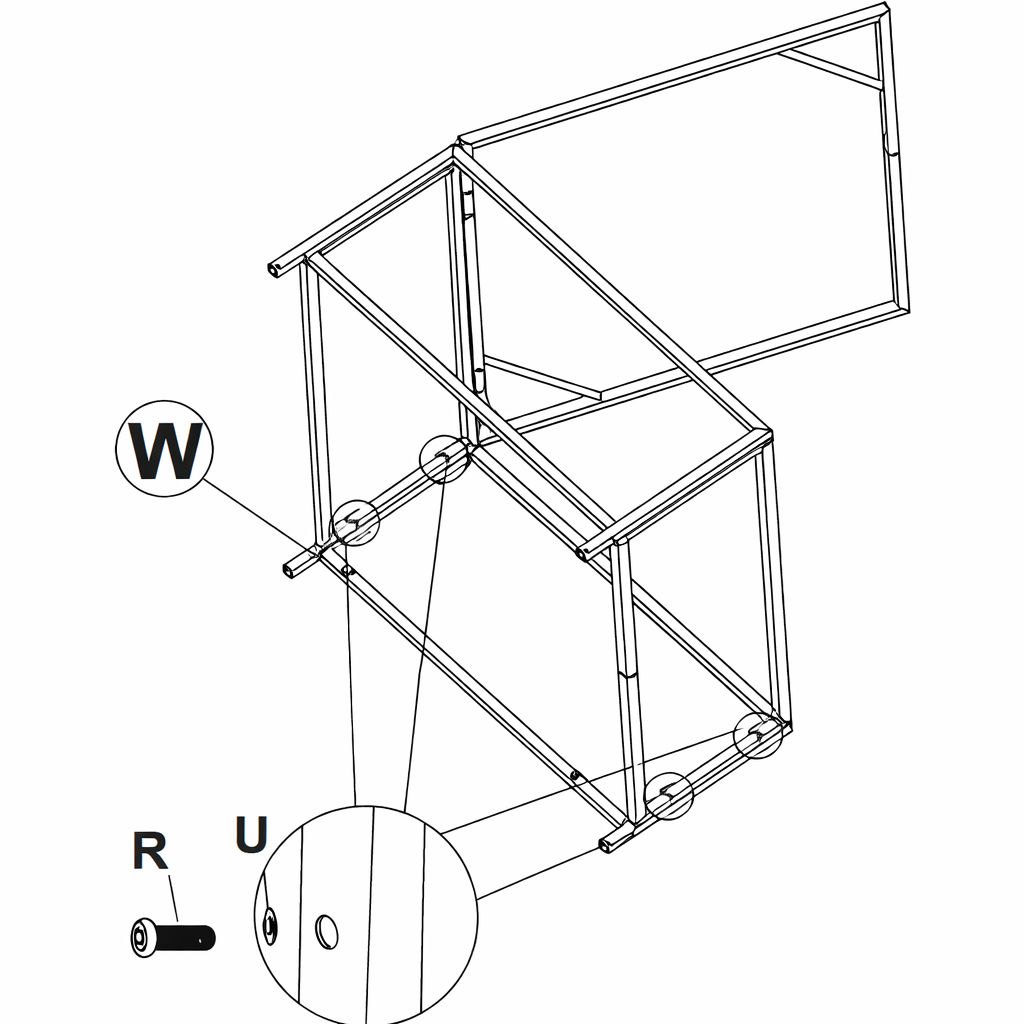 * Allineare tutti i fori con la base e i pannelli laterali. 3. Inserire Parte U attraverso i fori. 4. Fissare con Parte R. 5. Ripetere per tutti i punti di connessione mostrati.