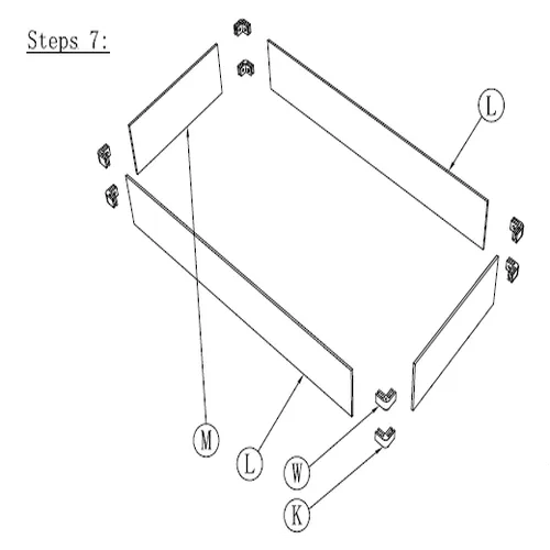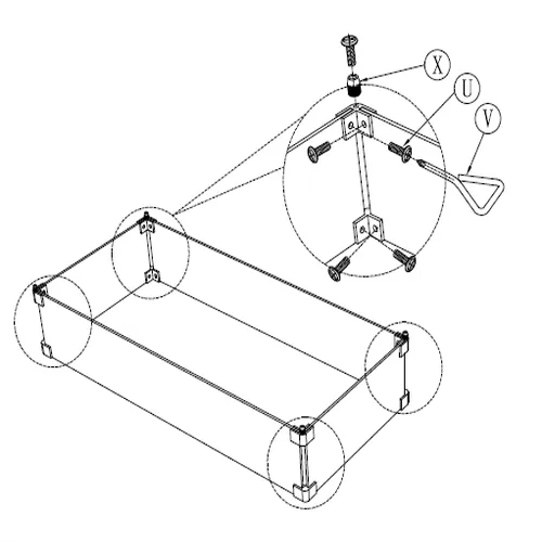 1. Unisci le Parti L e M utilizzando le Parti K e W. 2. Fissa ogni angolo con la Parte X. 3. Stringi tutti i fissaggi usando le Parti U e V. 4. Posiziona con cura i pannelli di vetro assemblati sulla parte superiore del tavolo del braciere, attorno all'apertura del bruciatore.