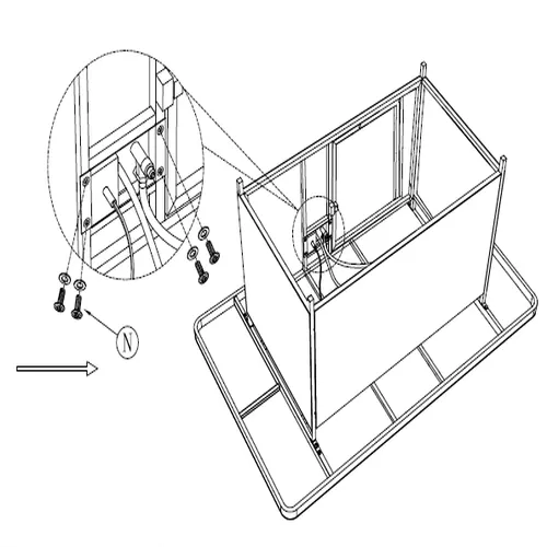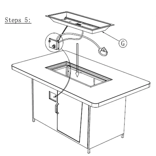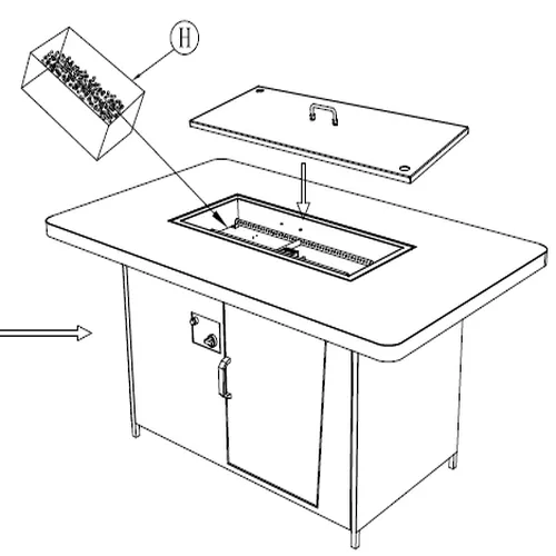 1. Abbassare con attenzione Parte del Tavolo G nell'apertura centrale del piano del tavolo, assicurandosi che sia livellata e correttamente posizionata nel telaio di supporto. 2. Allineare il tubo del gas pre-attaccato e i fili dell'accenditore dal vassoio del braciere con i punti di connessione interni all'interno dell'alloggiamento del tavolo. 3. Da sotto, instradare il tubo del gas attraverso il punto di accesso designato e fissarlo utilizzando i fissaggi forniti. 4. Utilizzare Parte del tavolo N, fissare saldamente la scatola di controllo del gas e i componenti dell'accenditore al telaio, come mostrato nel diagramma dettagliato. 5. Assicurarsi che tutte le connessioni del tubo del gas siano strette e sigillate, e che i fili elettrici siano collegati correttamente all'interruttore dell'accenditore. 6. Fare riferimento alle istruzioni del produttore per il collegamento sicuro del regolatore del gas (non mostrato) alla fonte di combustibile (ad es. bombola di propano). 7. Confermare che il tubo del gas non sia piegato, pizzicato o a contatto con parti calde o in movimento.