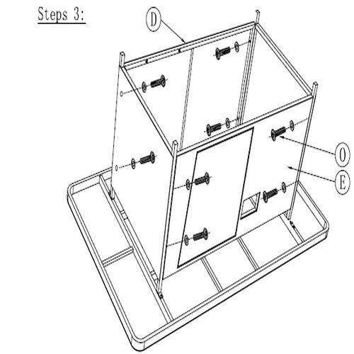 1. Posizionare le Parti D verticalmente tra i supporti verticali assemblati nel Passo 2. 2. Posizionare la Parte E in modo che si adatti perfettamente tra i due pannelli laterali. 3. Allineare tutti i pannelli con i fori preforati sui telai laterali. 4. Fissare ogni pannello utilizzando le Parti O, inserendole attraverso il telaio e nei pannelli. 5. Assicurarsi che tutte le viti siano serrate uniformemente e saldamente utilizzando lo strumento appropriato, ma non stringere eccessivamente per evitare di danneggiare i pannelli.