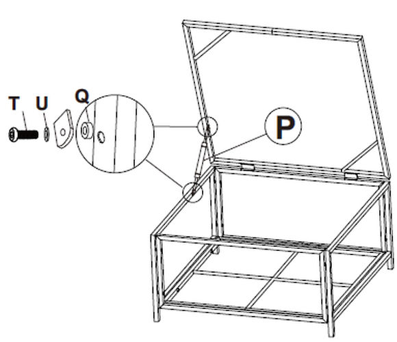 1. Aprire il coperchio e tenerlo in posizione verticale. 2. Prendere Parte P e posizionarla tra il coperchio e l'interno del pannello laterale, come mostrato. 3. Allineare i fori sul braccio di supporto con i fori sul coperchio e sul telaio. 4. Inserire Parte T attraverso Parte U e Parte Q, quindi attraverso i fori. 5. Stringere saldamente.