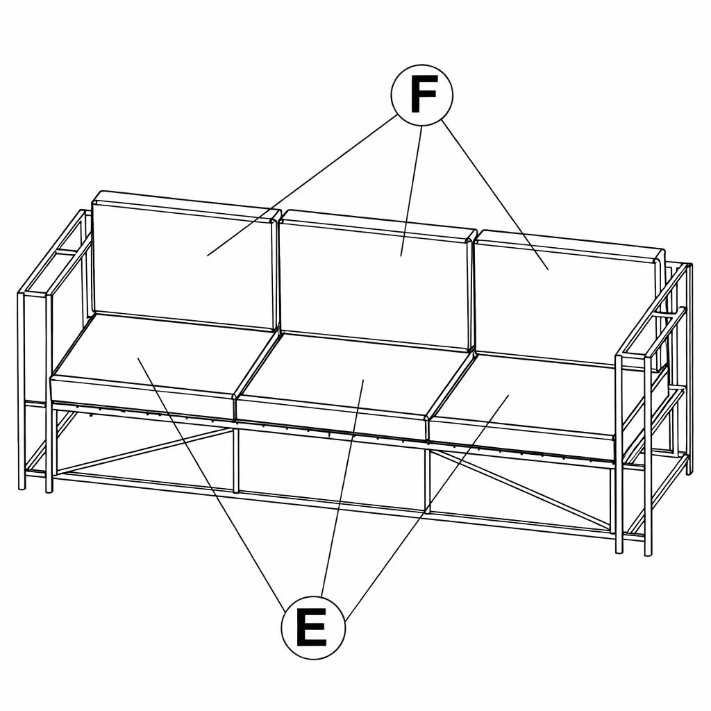 1. Assicurati che il telaio del divano sia completamente assemblato e che tutti i bulloni siano stretti. 2. Posiziona Parte E sulla base del divano.