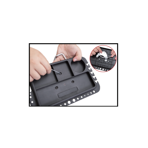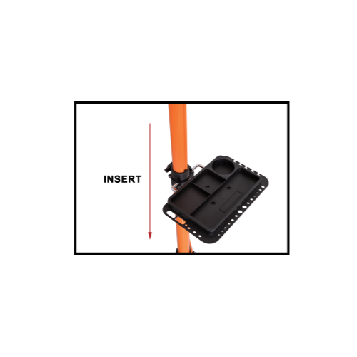 Lijn de armen van de borgclip uit met de gaten op de standaard en druk naar beneden totdat de gereedschapsbak op zijn plaats zit.