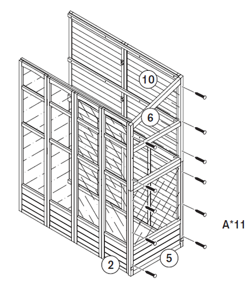 Lijn het bovenste zijpaneel (Deel 6) uit en schroef het vast aan de achterpanelen (Deel 10) en voorpanelen (Deel 2) met de schroeven (Deel A).