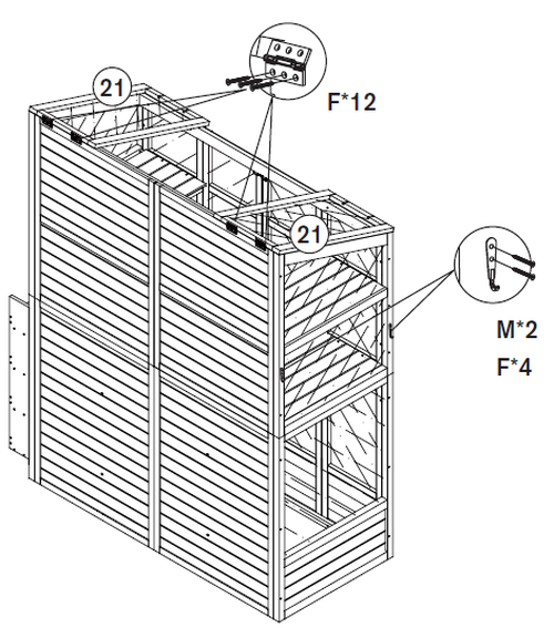 Bevestig, zoals in de vorige stap, de haken (Deel M) aan de buitenkant van de kas, aan de tegenovergestelde kant van de haken die in Stap 11 zijn geïnstalleerd.