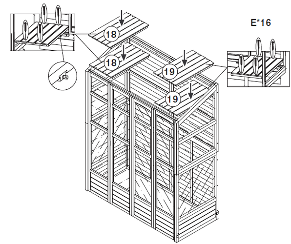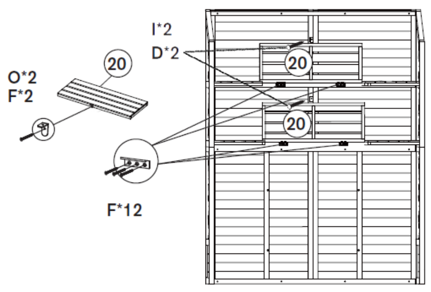 Gebruik de schroeven (Deel E) om de planken (Delen 18 en 19) te installeren. De planken moeten in de steunbalken worden geschroefd.