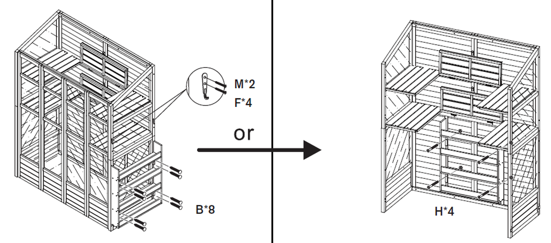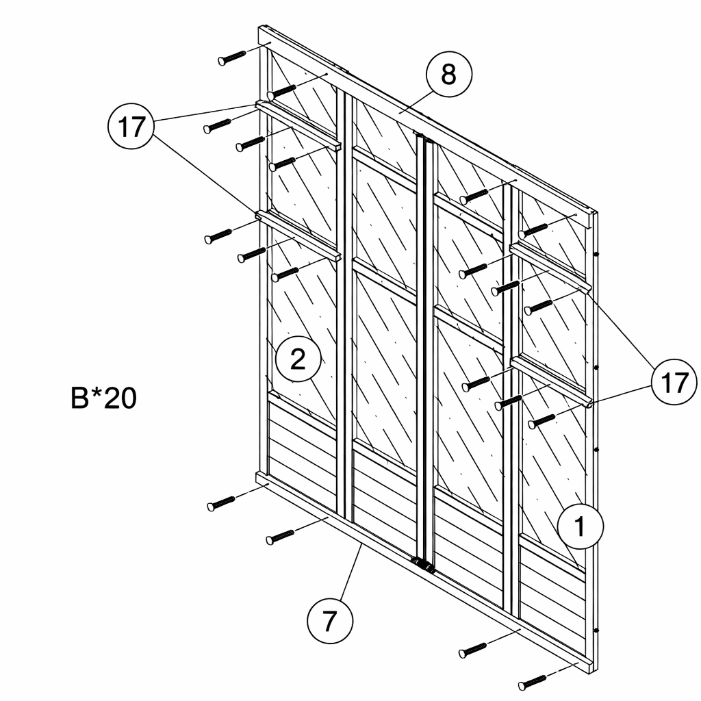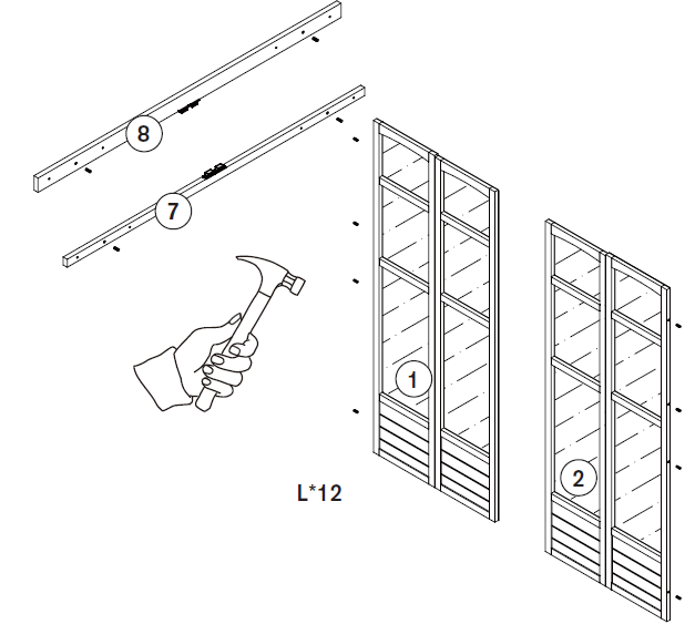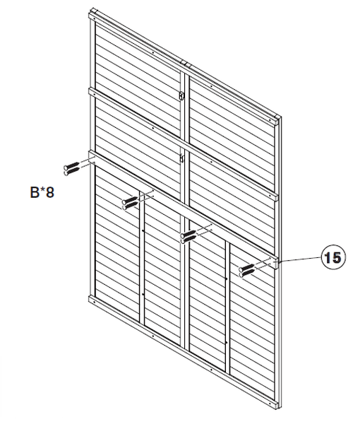 Bevestig de houten steunbalken (Deel 7 en 8) aan de deurpanelen (Deel 1 en 2) met behulp van de schroeven (Deel B).