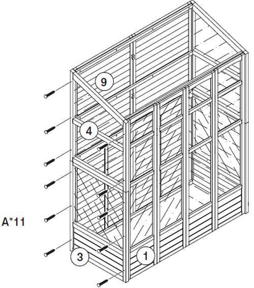 Lijn het bovenste zijpaneel (Deel 4) uit en schroef het vast aan de achterpanelen (Deel 9) en voorpanelen (Deel 1) met behulp van de schroeven (Deel A).