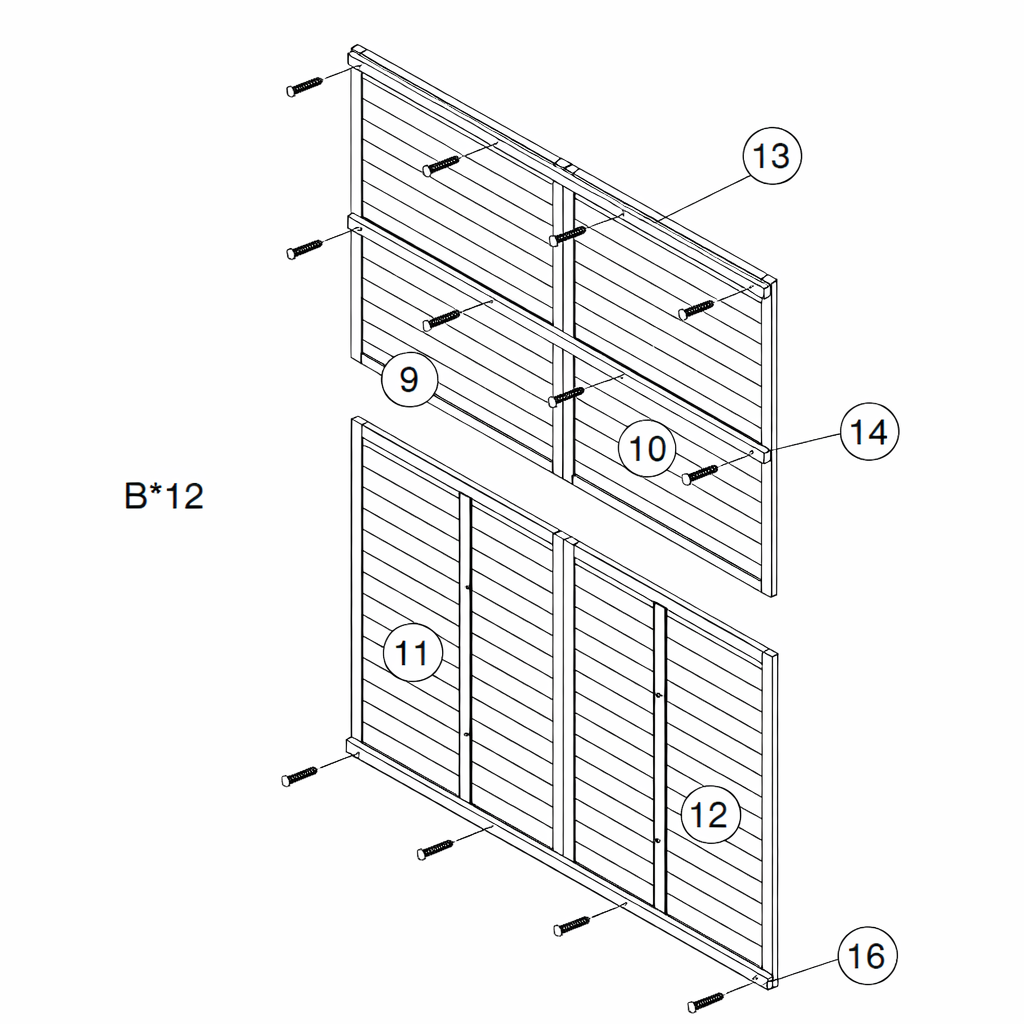 Schroef de steunbalken (Deel 13, 14 en 16) in de achterpanelen (Deel 9, 10, 11 en 12), gebruikmakend van de schroeven (Deel B).