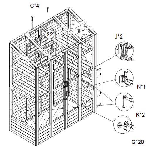 Bevestig de haken (Deel M) aan de buitenkant van de kas, op het zijpaneel.