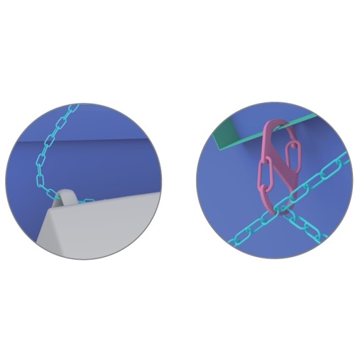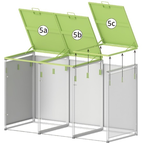 Haal de Metalen Ketting (A20) door de handvatten van de afvalcontainer. Verbind de ketting met de Bovendekpanelen (Deel 5a en 5b) met behulp van de Metalen Ringen (Deel A18).