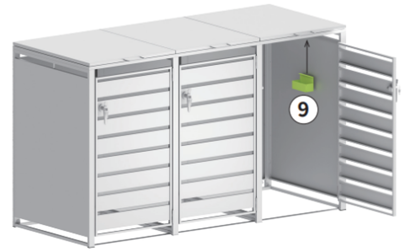 Bevestig vervolgens de houder voor geurblokje aan de afvalcontaineropslag met de meegeleverde schroeven (Onderdeel G21).