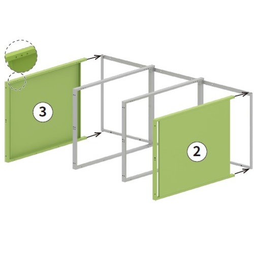 Installeer de Zijpanelen (Deel 2 en 3) op de Onderframes (Deel 1A en 1B) met behulp van Schroeven (Onderdeel G25).