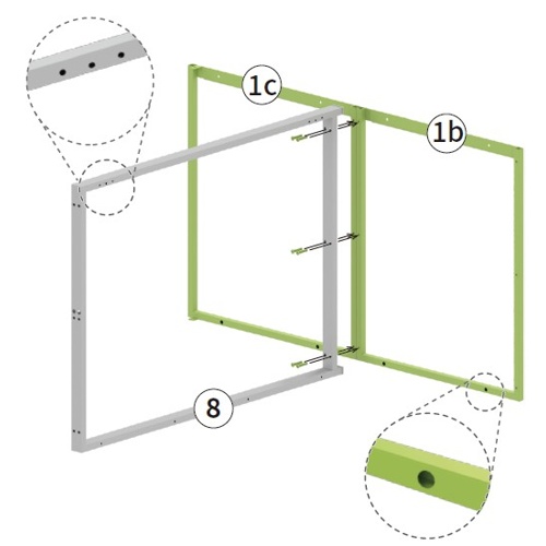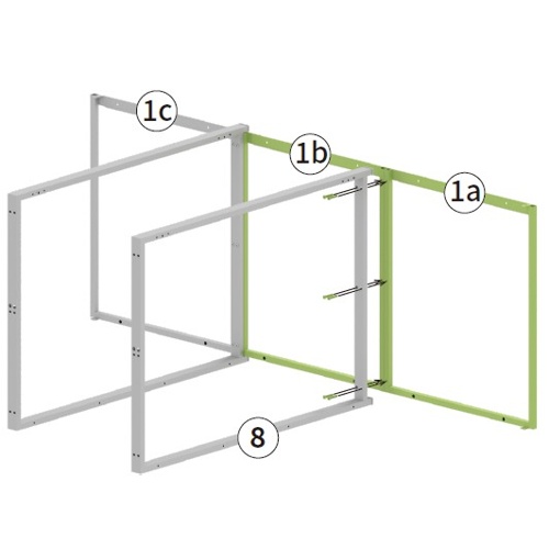 Installeer Onderframes (Onderdeel 1b en 1c) aan het Middenframe (Onderdeel 8) met behulp van Schroeven (Onderdeel G26).