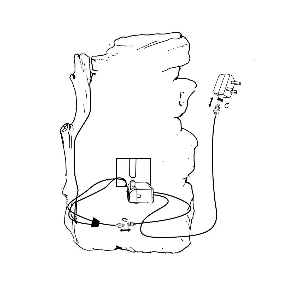 Sluit de stroomkabel aan op het stopcontact. Als alles correct is geïnstalleerd, zou er water uit de fontein moeten stromen. Bij eerste gebruik kan er mogelijk lucht in de pomp zitten, dus het kan enkele minuten duren voordat de lucht ontsnapt.