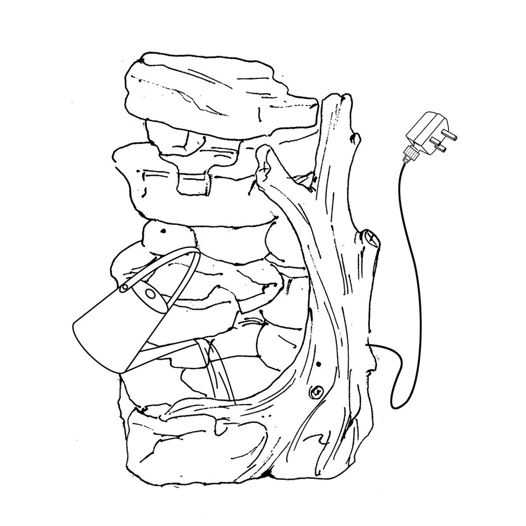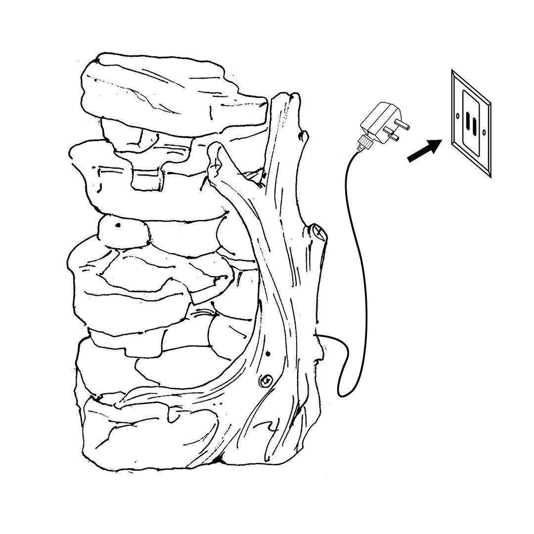 De structuur bootst op kunstzinnige wijze verweerde rotsformaties na, compleet met natuurlijke spleten en vloeiende lijnen, terwijl een gedetailleerd takachtig element elegant langs de zijkant buigt—toevoegend aan een bosachtige esthetiek die de sereniteit van de natuur oproept. Water stroomt soepel van laag naar laag, nabootsend het geluid van een zachte stroom en creëert een rustgevende akoestische achtergrond voor uw buitenleefruimte.