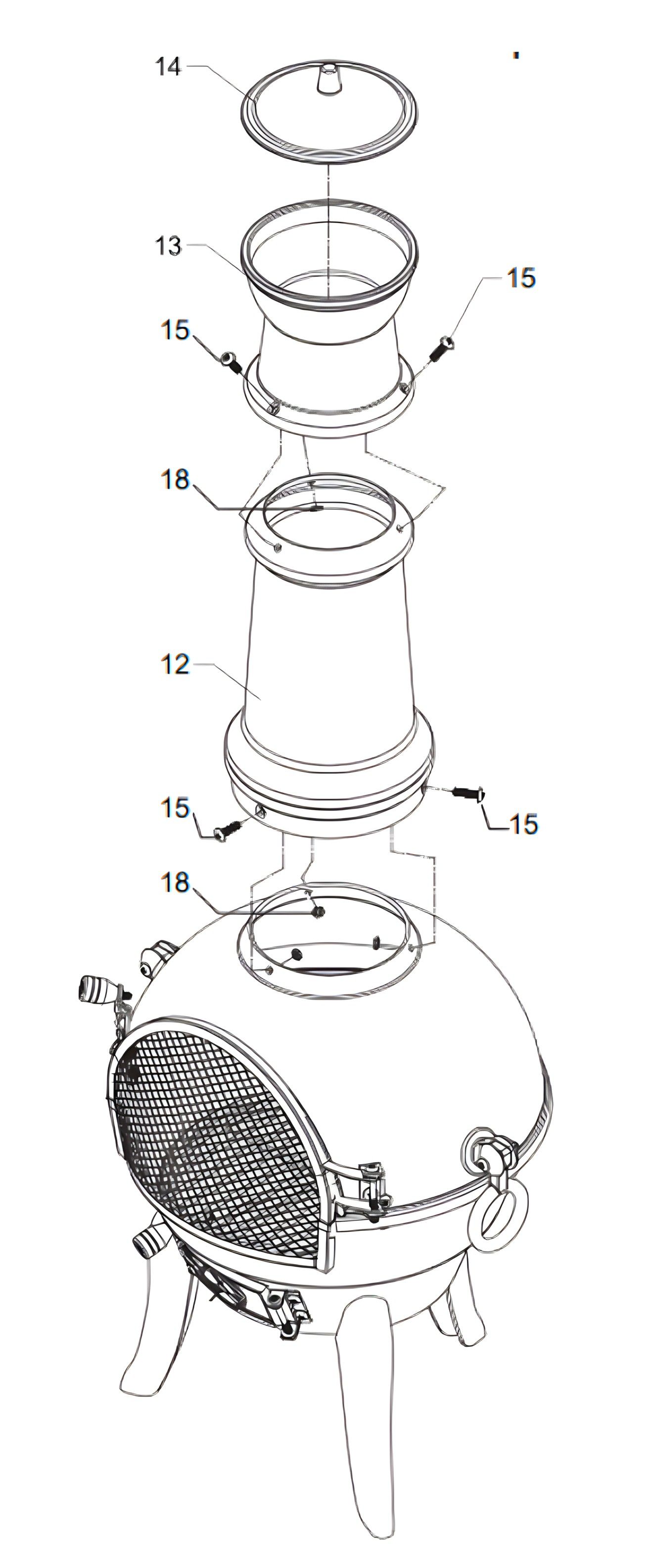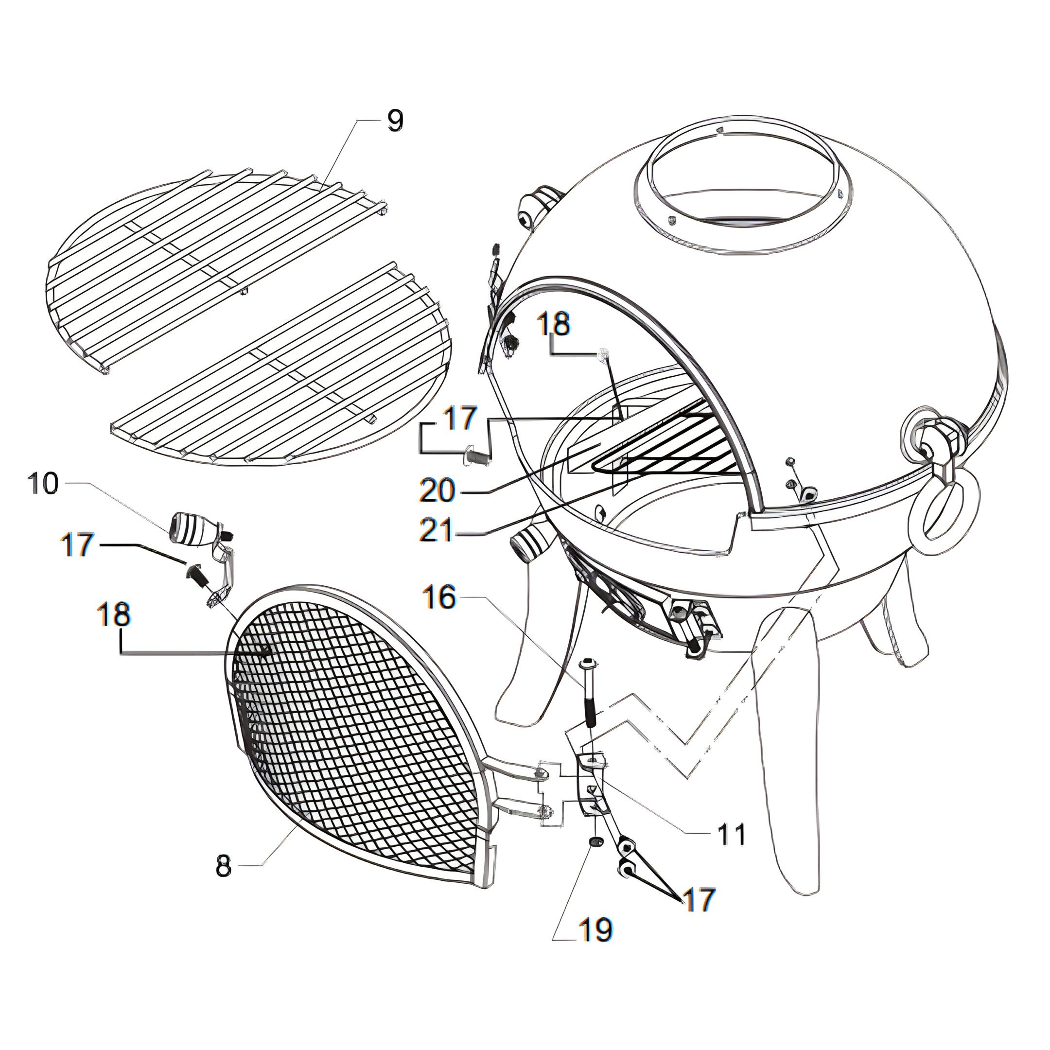 Parts![]() 1Perna 2Tigela de base 3Ventilação de ar 4Trava de ventilação de ar 5Tampa da taça 6Pega 7Estrutura da porta de malha 8Fecho da moldura da porta 9Chaminé (base) 10Chaminé 11Tampa da chaminé 12Suporte 13grelha de carvão 14Placa da moldura da porta 15Parafuso M6*L25 16Parafuso M5*L60 17Parafuso M6*L15 18Porca M6 19Porca M5 20Prateleira para grelha 21Grelha 22Pegas da grelha 23Atizador 1. Verificação das PeçasCertifique-se de que possui todas as peças necessárias para montar a Chaminé verificando com a lista de peças fornecida. 2. Anexar as Pernas![]() Anexe as 3 pernas (1) à base (2) usando os parafusos (17) fornecidos. 3. Fixação dos Suportes![]() Aperte os 3 suportes (5) no lugar usando três parafusos (17) e três porcas (18). 4. Instalação da Ventilação de Ar![]() Anexe a ventilação de ar (3) por baixo da reentrância da estrutura da porta na base (2) no lado direito, e depois a trava de ventilação de ar (4) no lado esquerdo, utilizando os parafusos (17) e porcas (18) fornecidos. 5. Colocação da Tampa da Taça![]() Coloque a tampa da taça (6) em cima da base (2) e alinhe os furos pré-fabricados com os furos restantes nos suportes. Use três parafusos (17) e mais três porcas (18) para fixar a tampa de forma segura. 6. Fixação das Pegas![]() Fixe as pegas (7) em cada lado da chaminé usando parafusos (17). 7. Montagem da Grelha de Carvão![]() Coloque as 2 partes da grelha de carvão (9) juntas no fundo da tigela de base (2). 8. Anexar a Estrutura da Porta de Malha![]() ![]() Anexe a estrutura da porta de malha (8) à tampa da taça (6) primeiro aparafusando a placa da moldura da porta (11) no lugar usando os parafusos (17) e as porcas (18) fornecidas. Em seguida, fixe a estrutura da porta de malha (8) à placa (11) usando o parafuso longo (16) e a porca (19) fornecidos. 9. Fixação do Fecho da Moldura da Porta![]() Aperte o fecho da moldura da porta (10) no lugar com os parafusos (17) e porcas (18) fornecidos. 10. Instalação das Prateleiras e Grelha![]() Dentro da chaminé e acima da grelha de carvão, fixe as prateleiras (20) no lado direito e esquerdo, usando os parafusos (17) e as porcas (18). Prossiga colocando a grelha (21) entre as prateleiras (20). 11. Montagem da Chaminé![]() Para completar a chaminé, conecte a chaminé (base) (12) à tampa da taça (6), e depois conecte a chaminé (13) à chaminé (base) (12). Use os parafusos (15) e as porcas (18) para fixar estas partes. 12. Colocação da Tampa da ChaminéColoque a tampa da chaminé (14) no topo da chaminé montada. 13. LimpezaPara garantir a aparência da sua chaminé, limpe a superfície com um pano macio. Aplique um óleo para superfície de chaminé com um pano, se desejar. Não use uma escova de arame para limpar a superfície, pois isso pode riscar ou danificar o material da superfície. 14. ArmazenamentoCubra a chaminé com a sua capa de chuva quando não estiver em uso, para protegê-la contra condições meteorológicas adversas. Preferencialmente, leve a chaminé para dentro durante o inverno. Por favor, deixe a chaminé arrefecer completamente antes de a cobrir com a sua capa de chuva. 15. CorrosãoA ferrugem pode ocorrer em todos os produtos de ferro fundido. Para evitar isso o máximo possível, certifique-se de que as medidas de armazenamento acima sejam seguidas e que a chaminé não seja sobrecarregada. Se a corrosão já ocorreu, podem ser usadas tintas de alta temperatura para retocar a ferrugem na chaminé. 16. Guia de ResoluçãoO que devo fazer se houver peças em falta no meu pedido? Se parecer que falta alguma peça no seu pedido, contacte a nossa simpática e prestável Equipa de Apoio ao Cliente no prazo de 7 dias após a receção. Para todos os outros problemas, por favor contacte a nossa Equipa de Apoio ao Cliente.