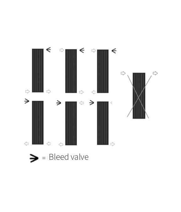 Certifique-se de que um ponto de purga permaneça sempre no topo da unidade. Se ligar ambas as alimentações na parte inferior, recomenda-se a utilização de um defletor. A tampa vermelha no radiador indica onde o fluxo deve entrar. Use uma chave inglesa para ajustar as tampas do radiador em cada extremidade.