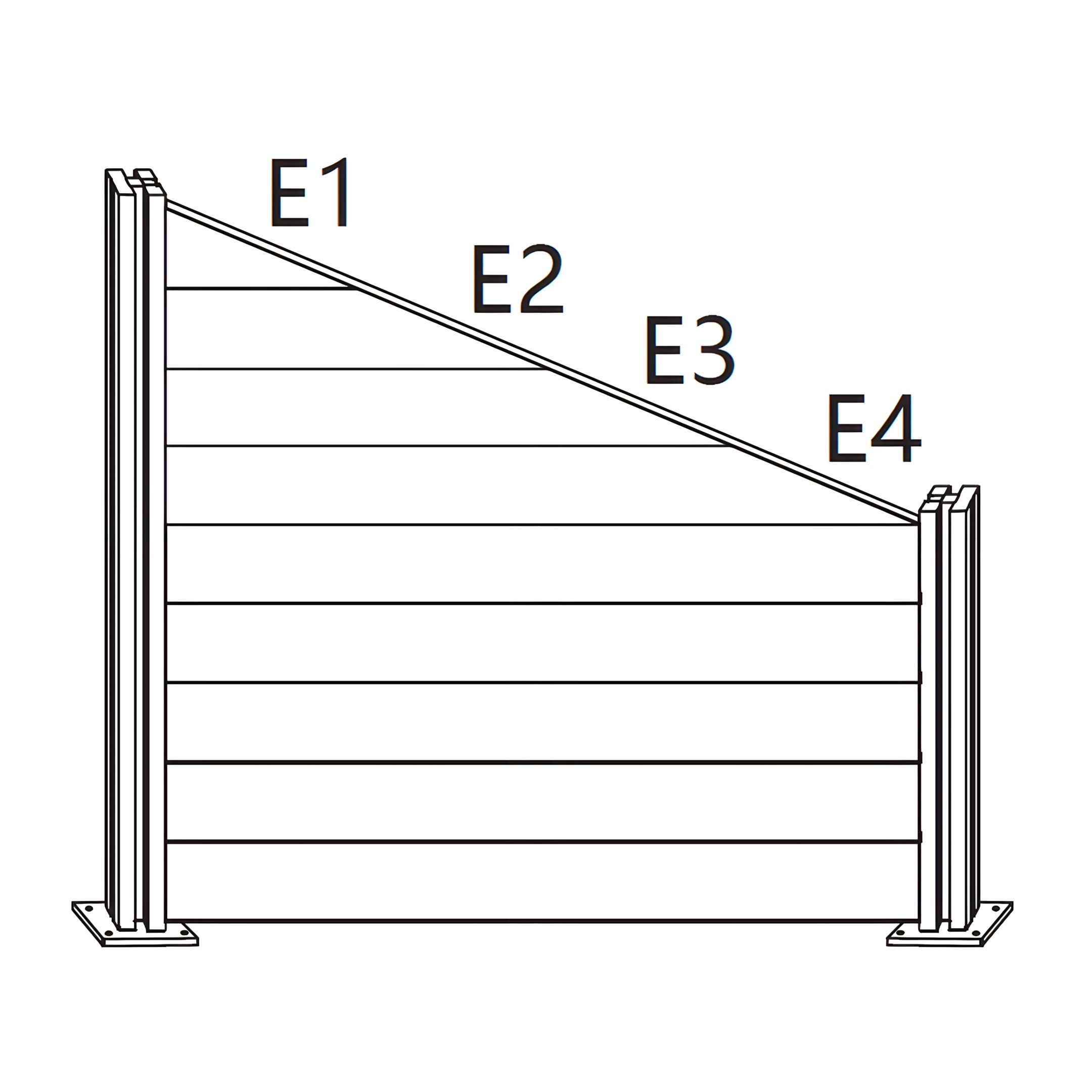 2. Fixe as Ripas de Vedação - Insira a Parte de Vedação E - Ripas de Vedação entre os postes. - Comece com a Parte de Cerca de Canto E1 - Ripas Superiores da Cerca e continue até a Parte de Cerca de Canto E4 - Quarta Ripa.