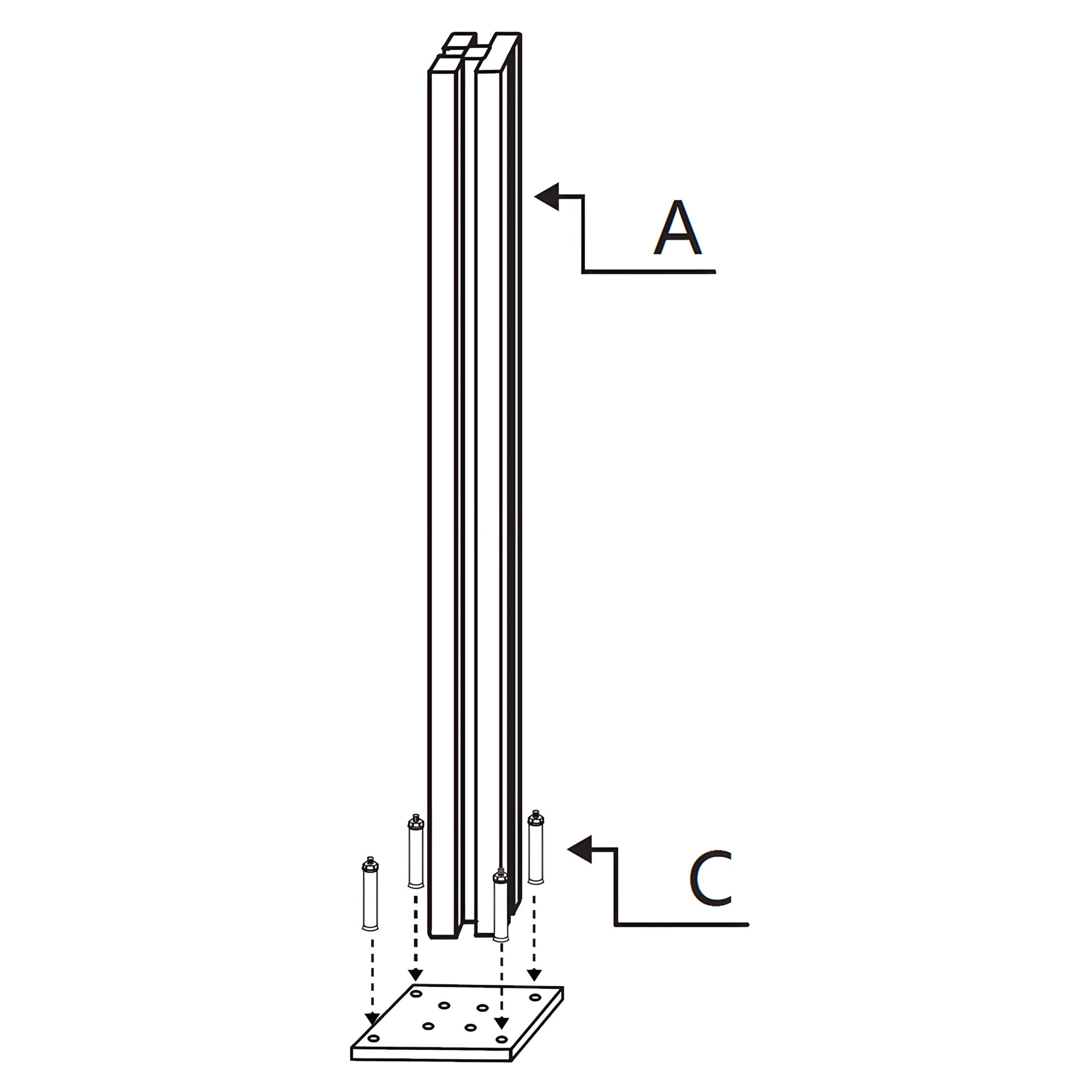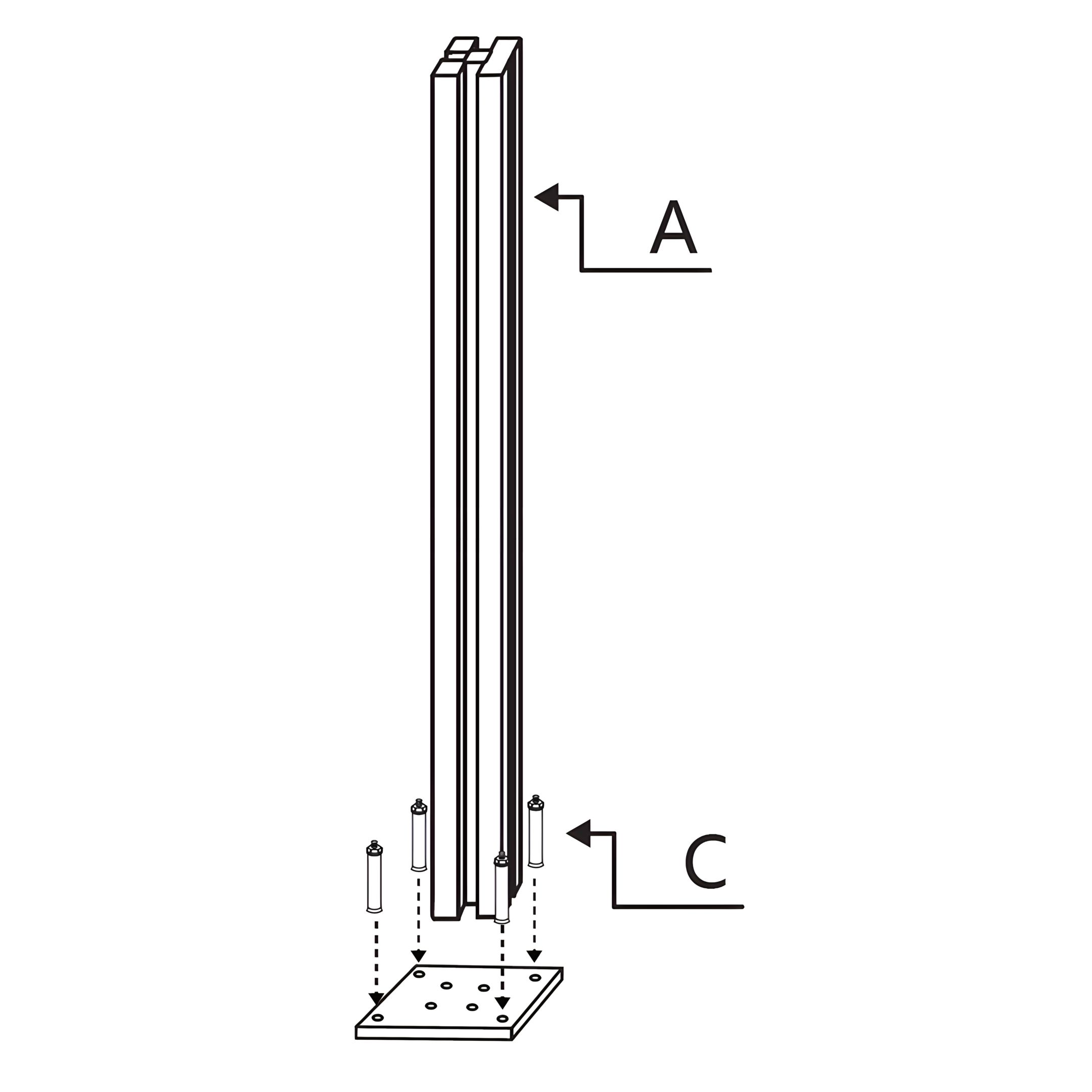 Fixe a Parte de Cerca de Canto A - Postes de Cerca de Alumínio com LED ao chão inserindo os Parte de Cerca de Canto C - Parafusos de Ancoragem ao Chão através dos orifícios da base e no solo. Assegure-se de que os postes estão estáveis e devidamente alinhados.