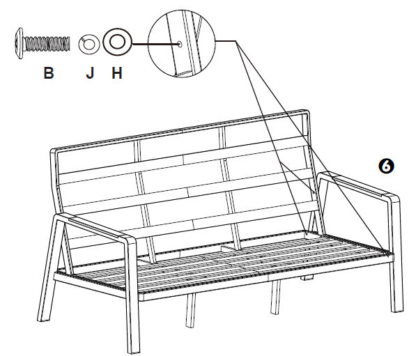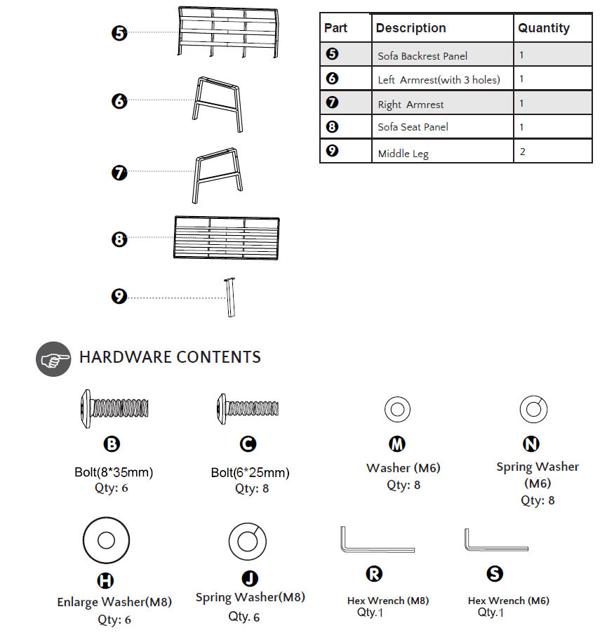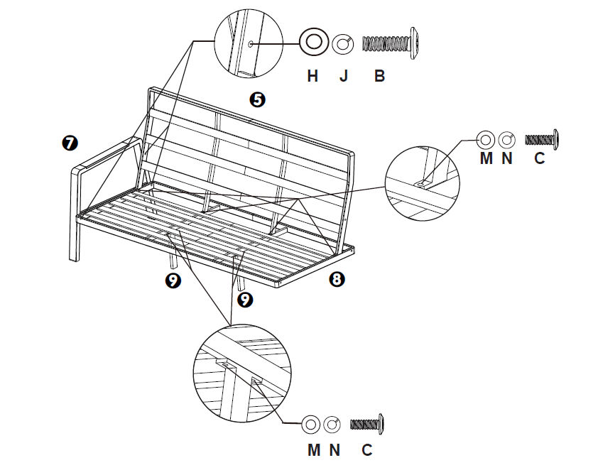 Använd Bricka (Delar H/M), Fjäderbricka (Delar J/M), och Bult (Delar B/C), montera ihop Ryggstödspanel för soffa (Del 5), Höger Armstöd (Del 7), Soffasits Panel (Del 8) och Mittbenet (Del 9).