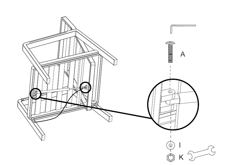 Använd Bricka (Del I), Bult (Del A) och Självlåsande mutter (Del K) för att montera dem tillsammans.