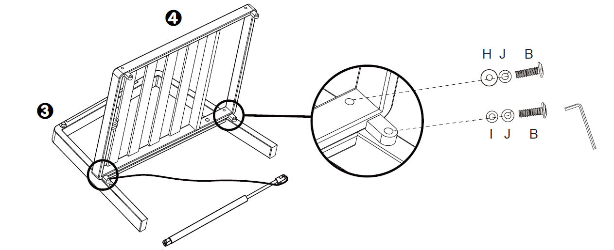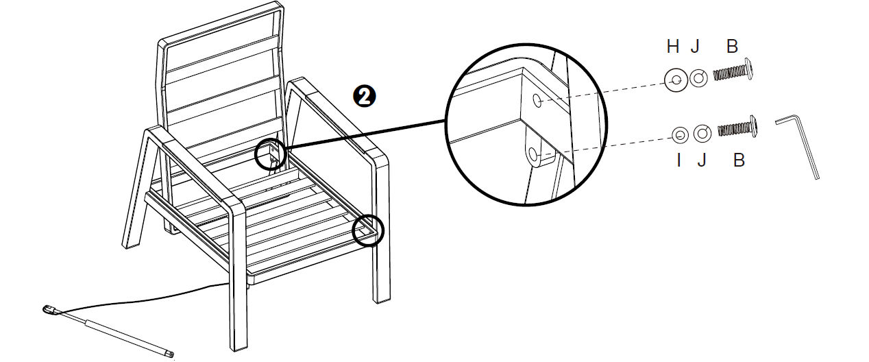 Använd sedan Bult 8x35mm (Del B), Bricka (Del I) och Fjäderbricka (Del J) i det nedre hålet på stolsits panelen för att säkra delarna tillsammans.
