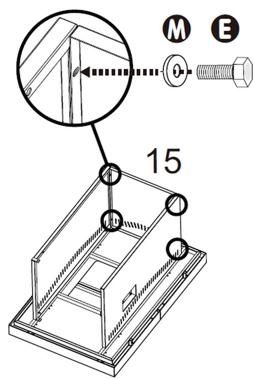Sätt in Bulten (Del E) genom Brickan (Del M) och sedan genom hålen på Ryggpanelen (Del 15) in i hålen på Sidopanel 1 och Sidopanel 2 (Delar 13/14).