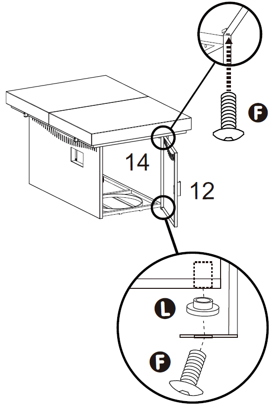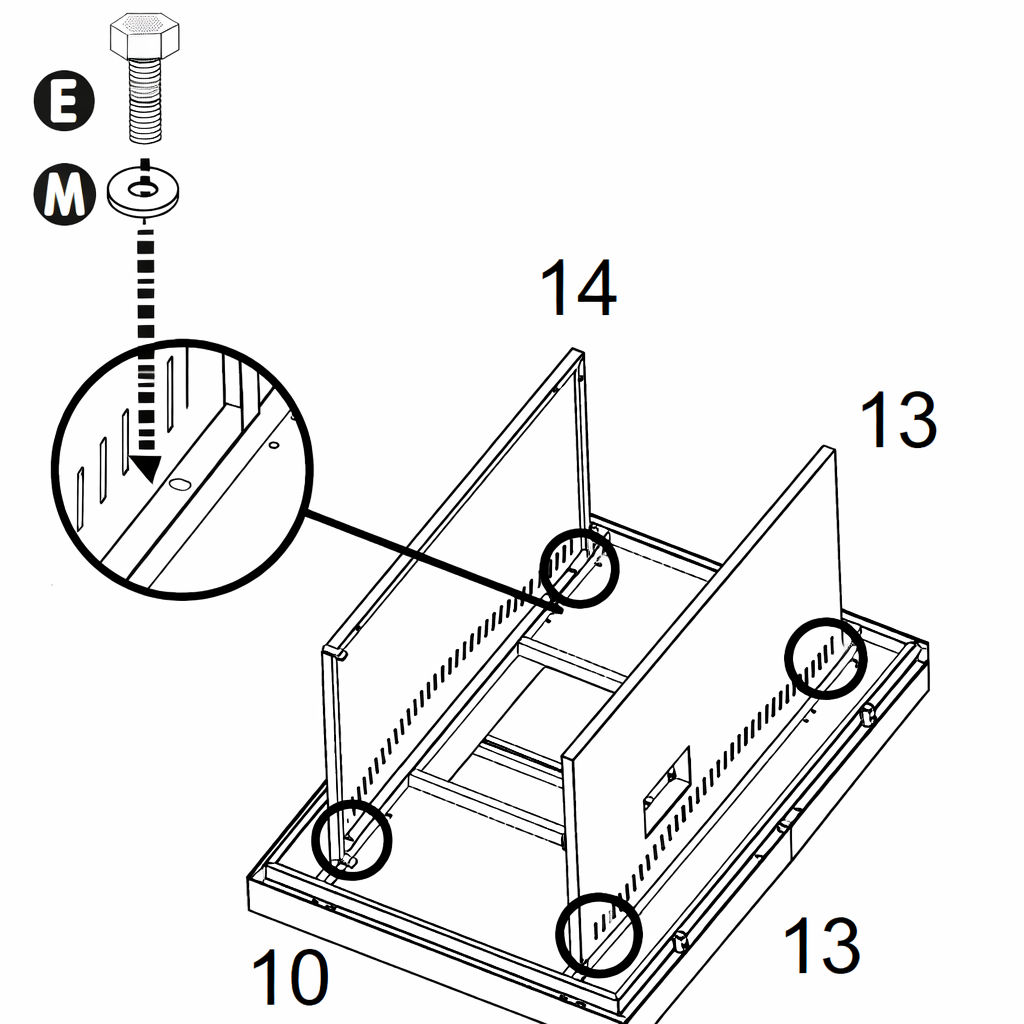 Placera en Bricka (Del M) på var och en av de 4 Bultarna (Del E) och sätt in genom hålen på Delar 13/14 i hålen på Bordsskivan (Del 10).